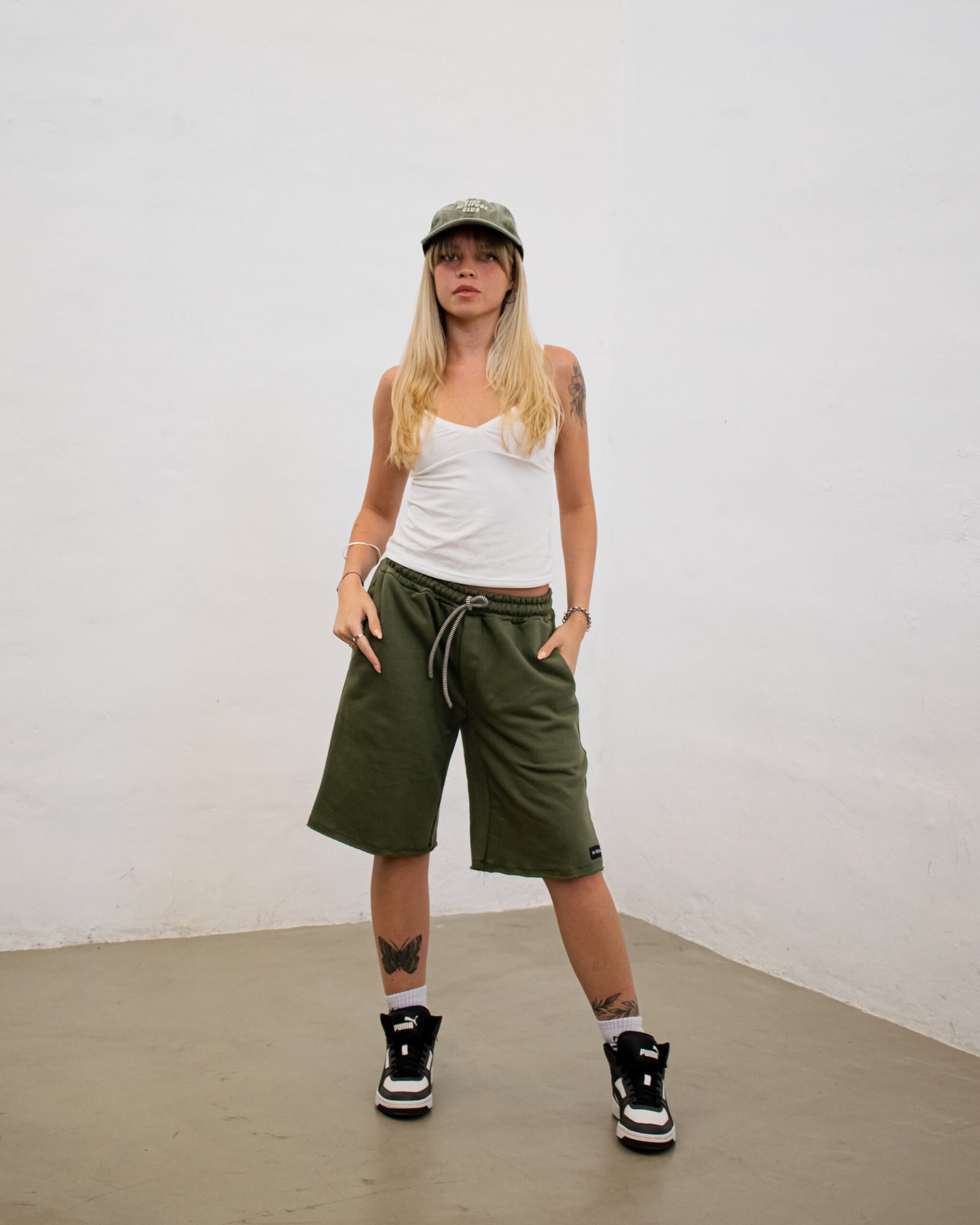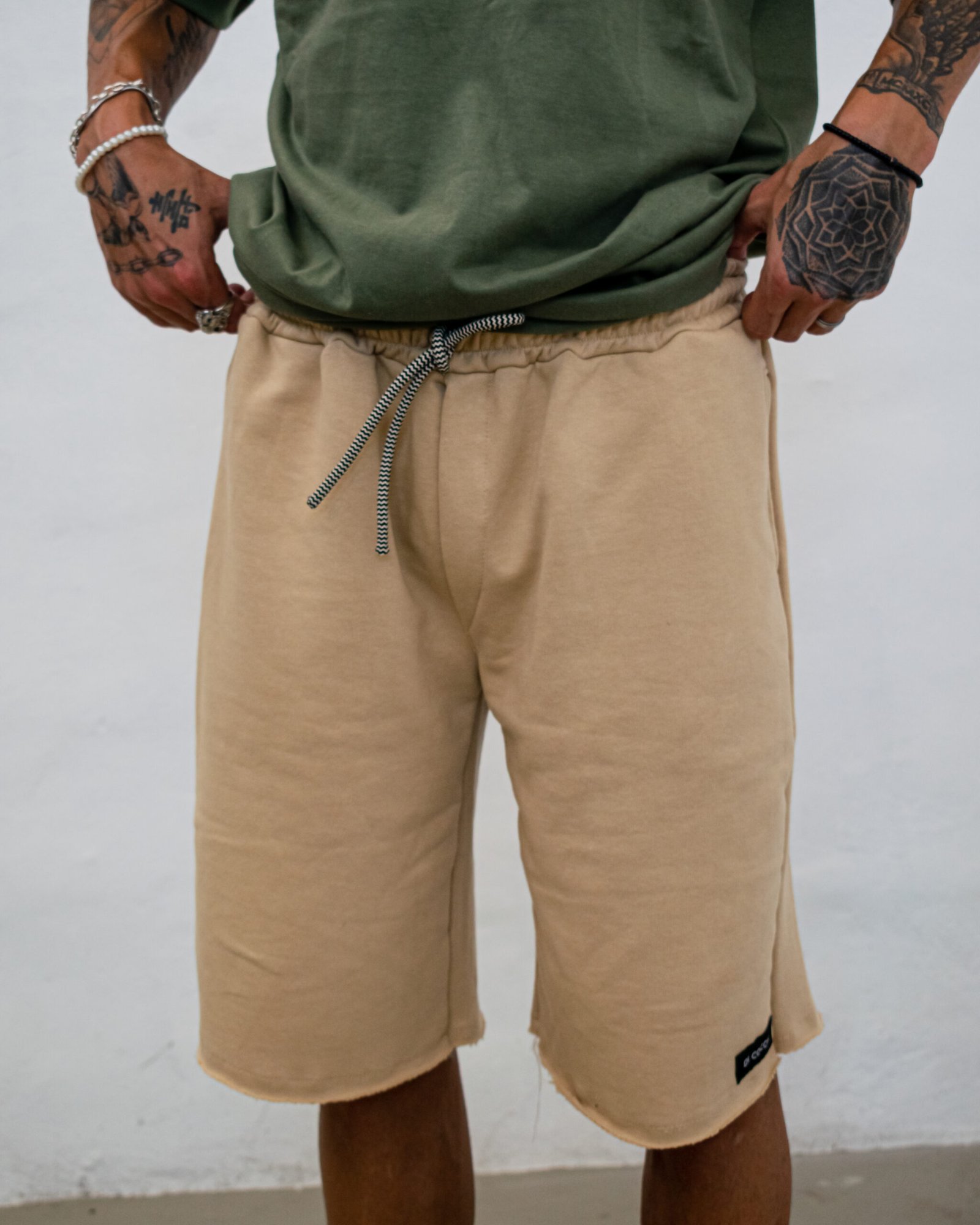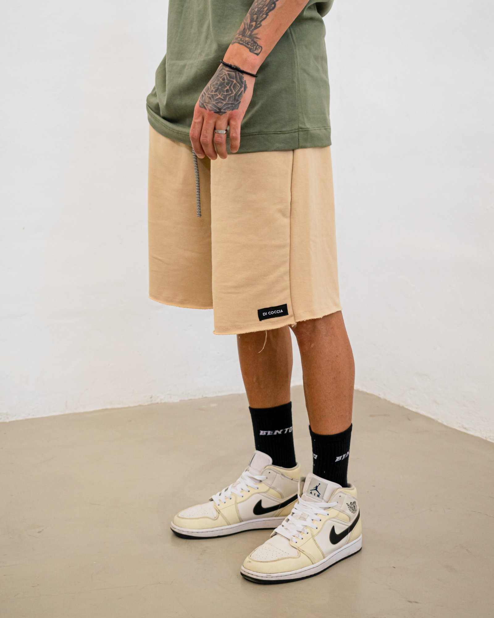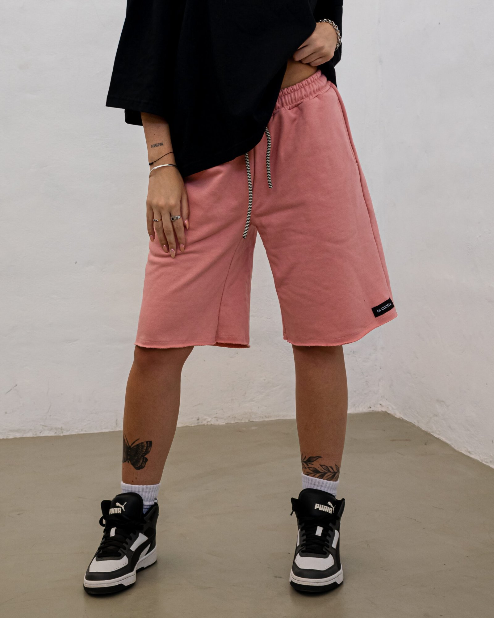 Bermuda oversize de “Rústico” con cordón regulable blanco y negro. Detalle de etiqueta Di Coccia externa.