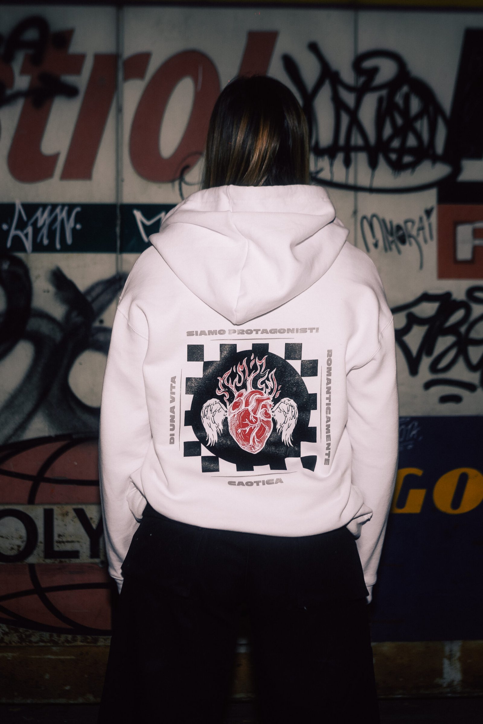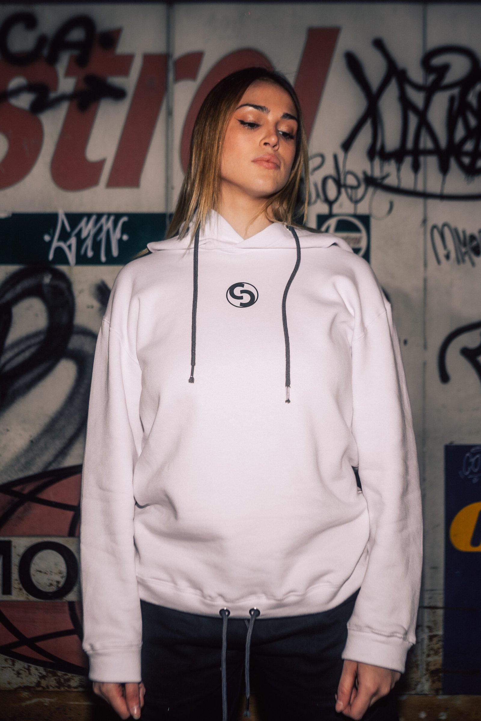 Buzo de frisa, con regulador en capucha y cintura. Estampa en serigrafía.