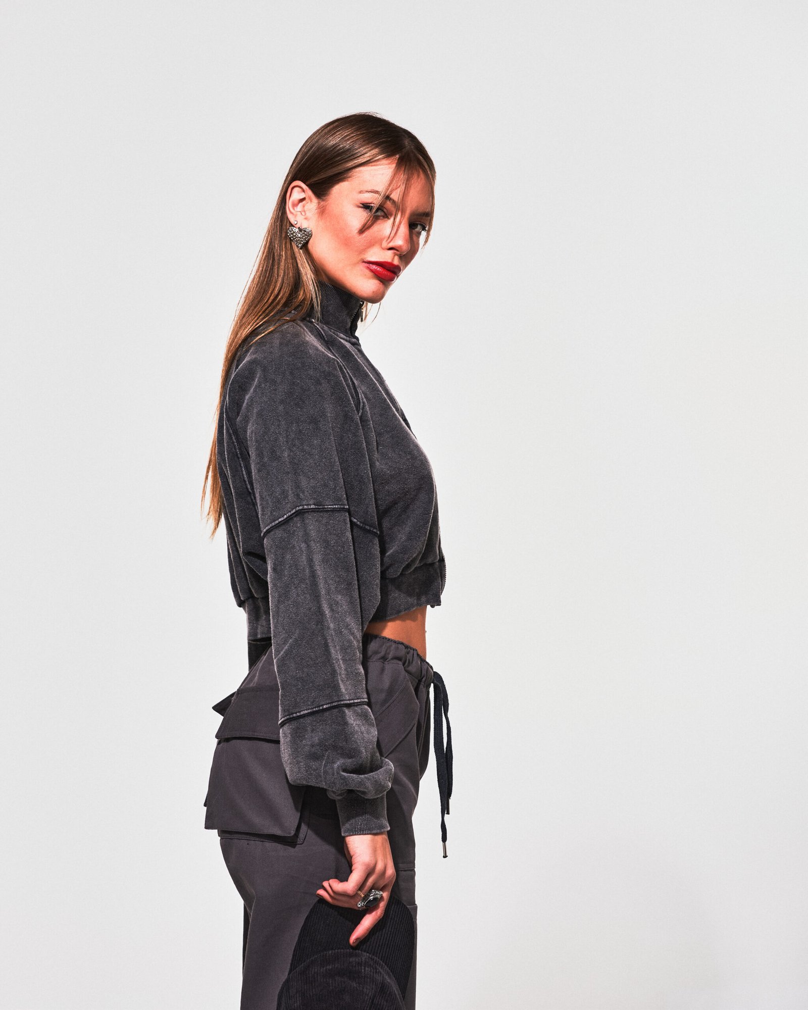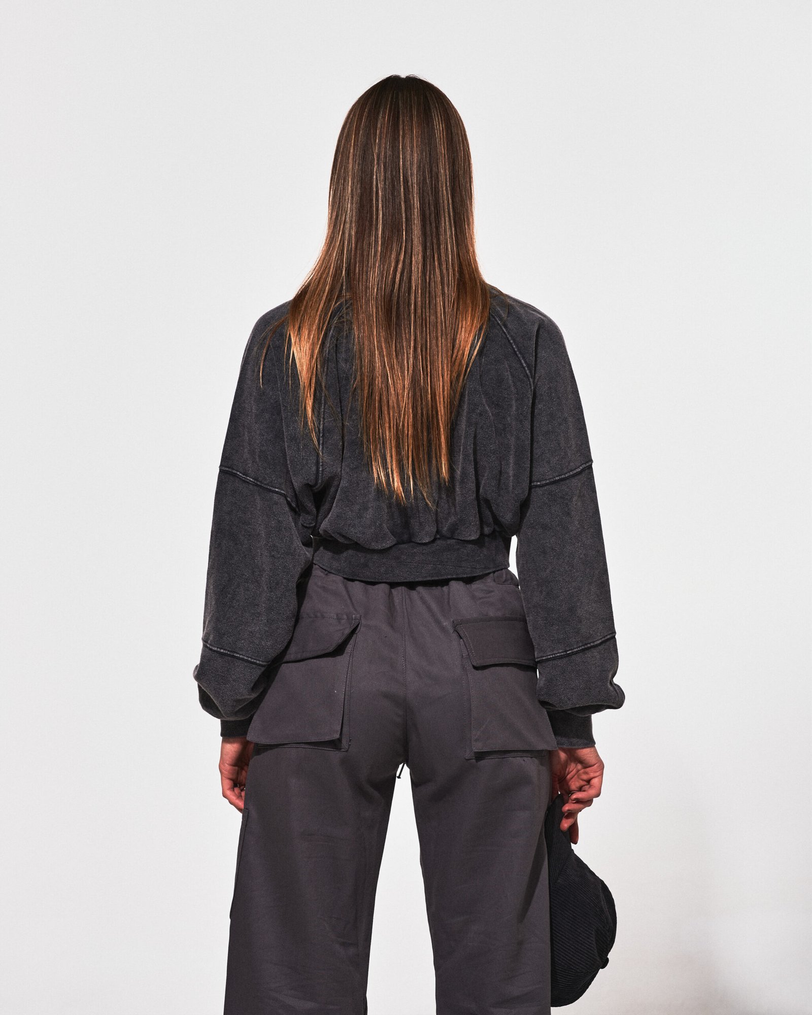 Campera crop con recortes, de algodón negra con efecto washed, y cierre metalizado.
