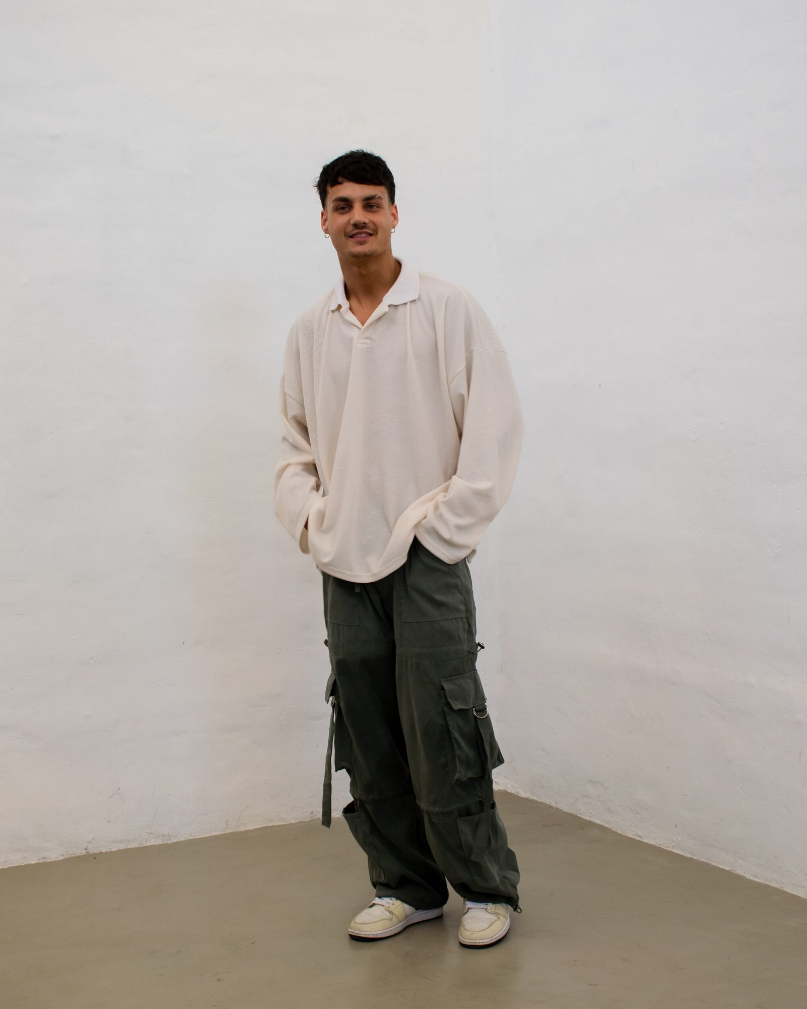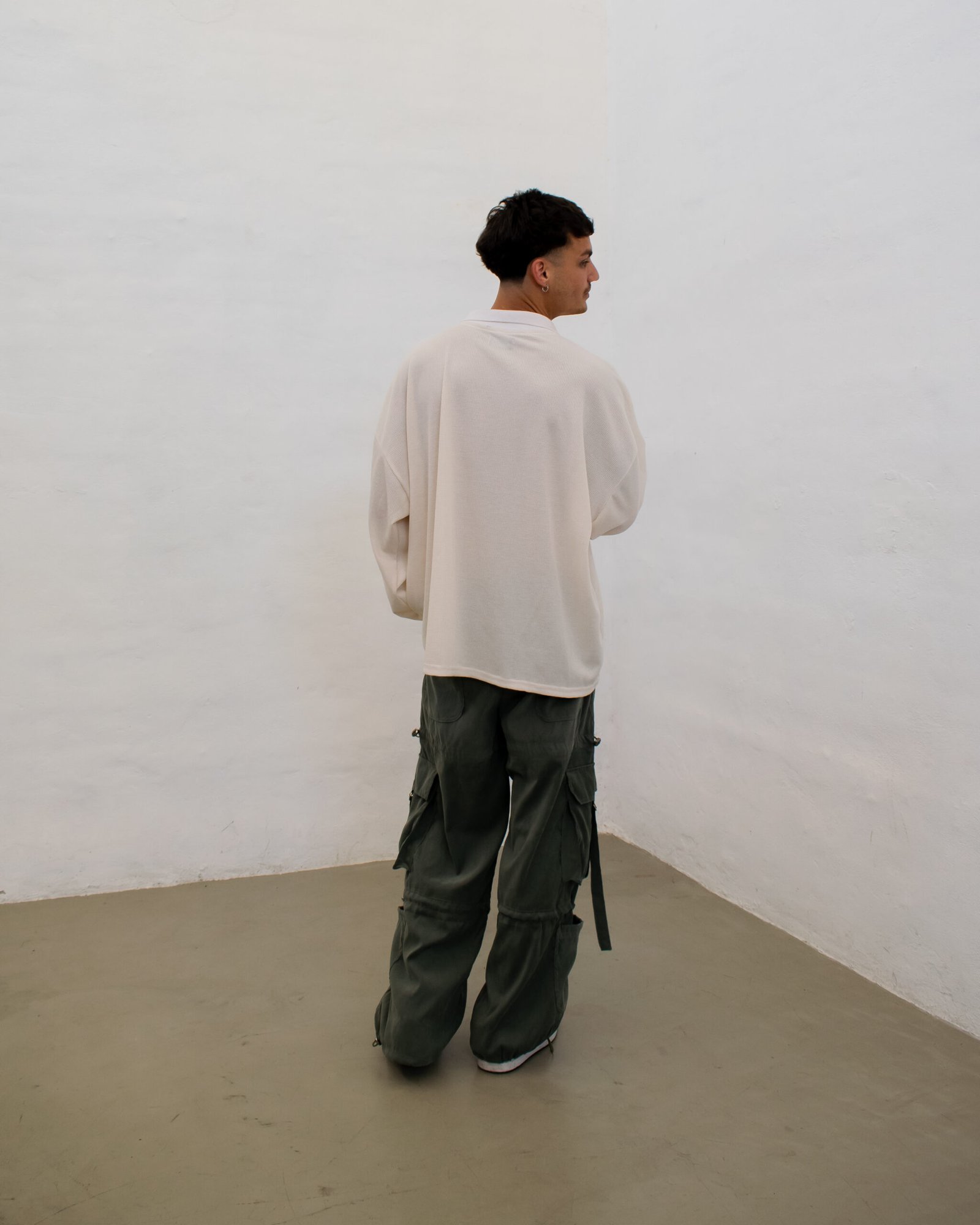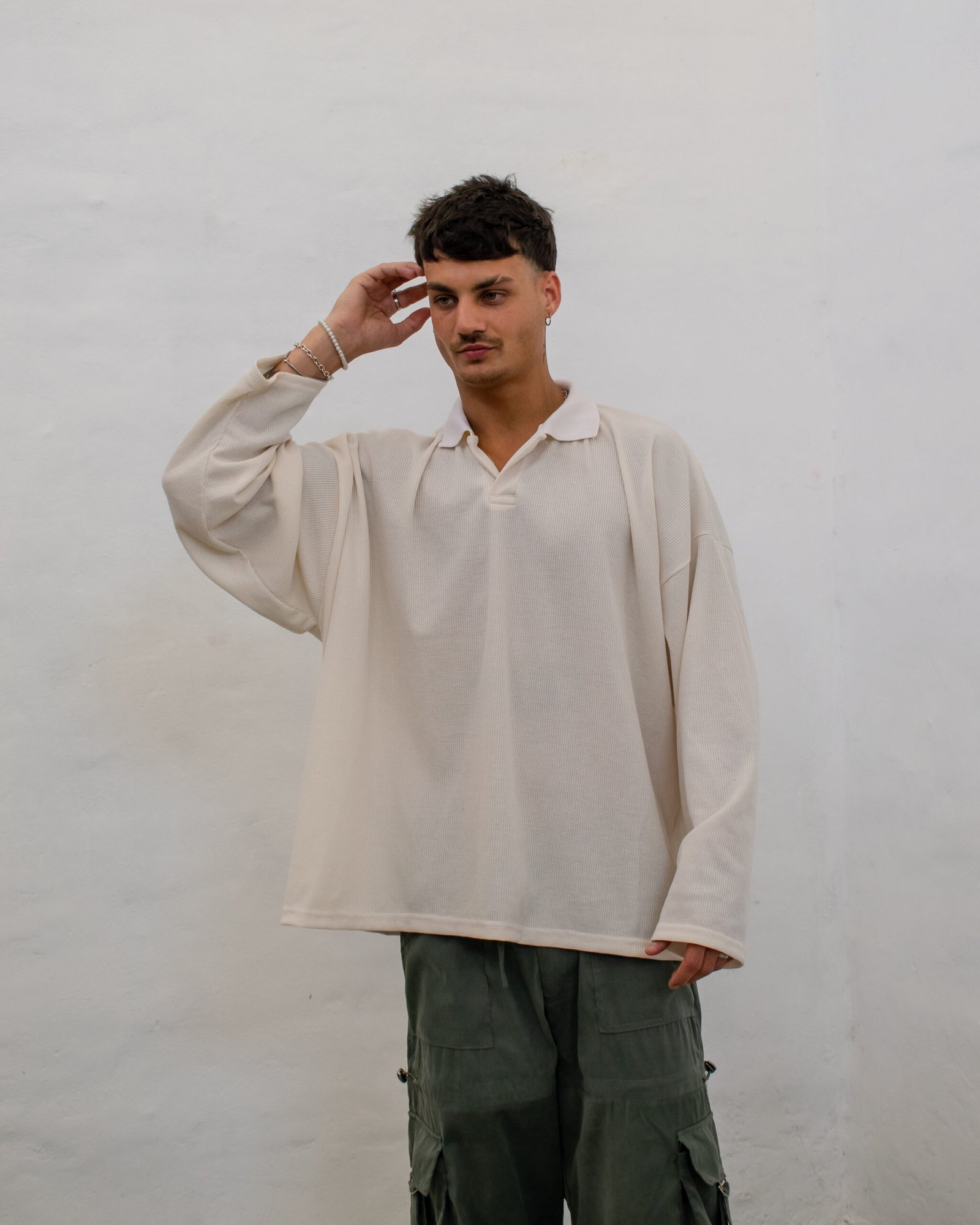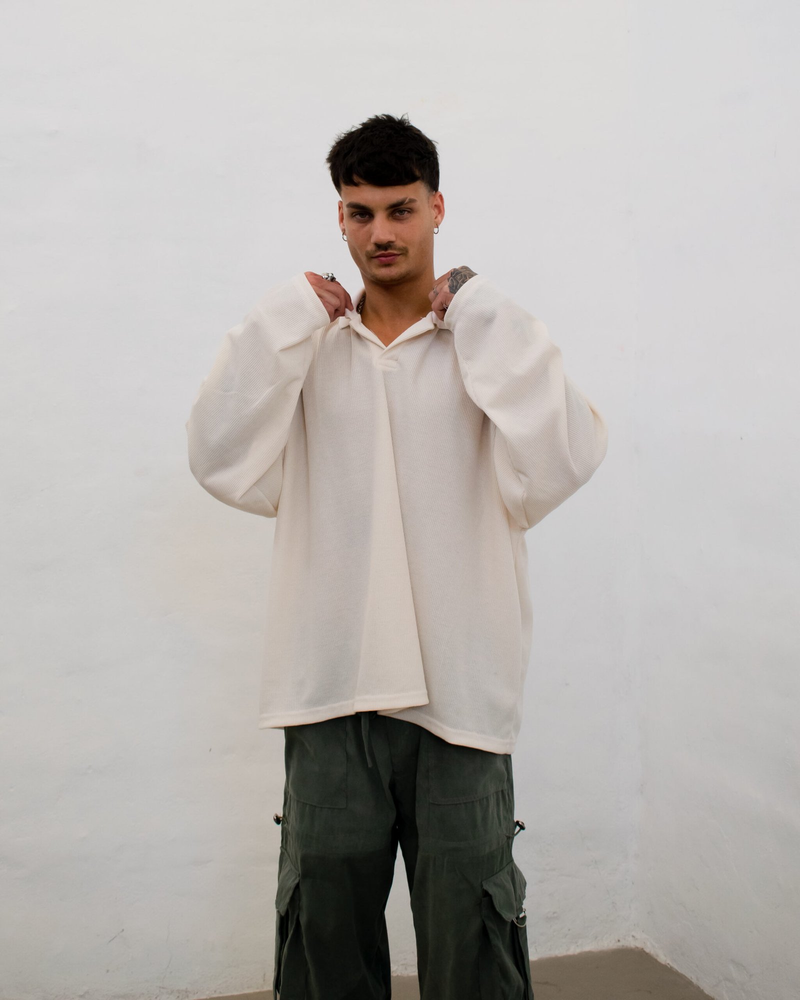 Chomba oversize de tela “Wafle” color crudo con cuello tejido color crudo.