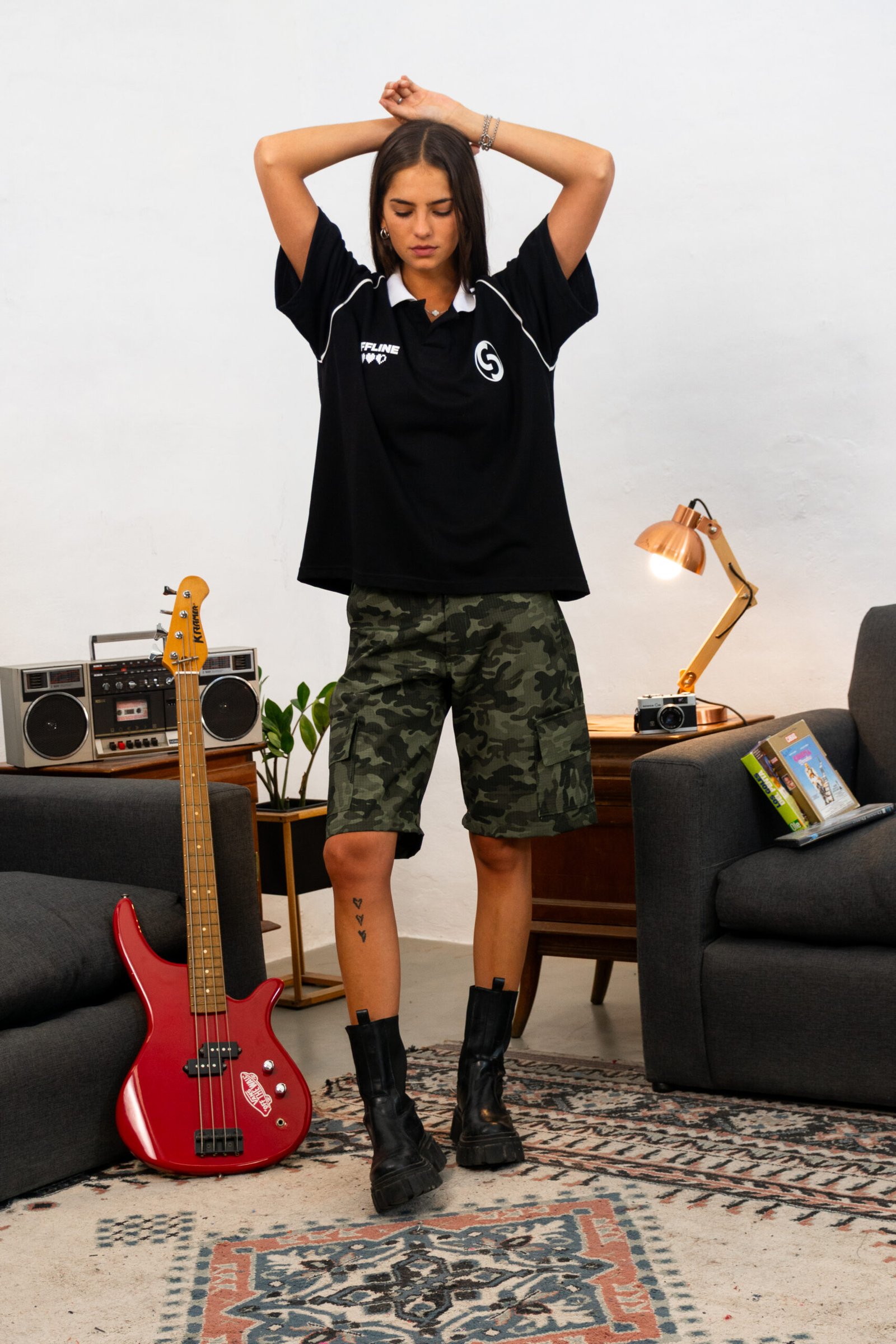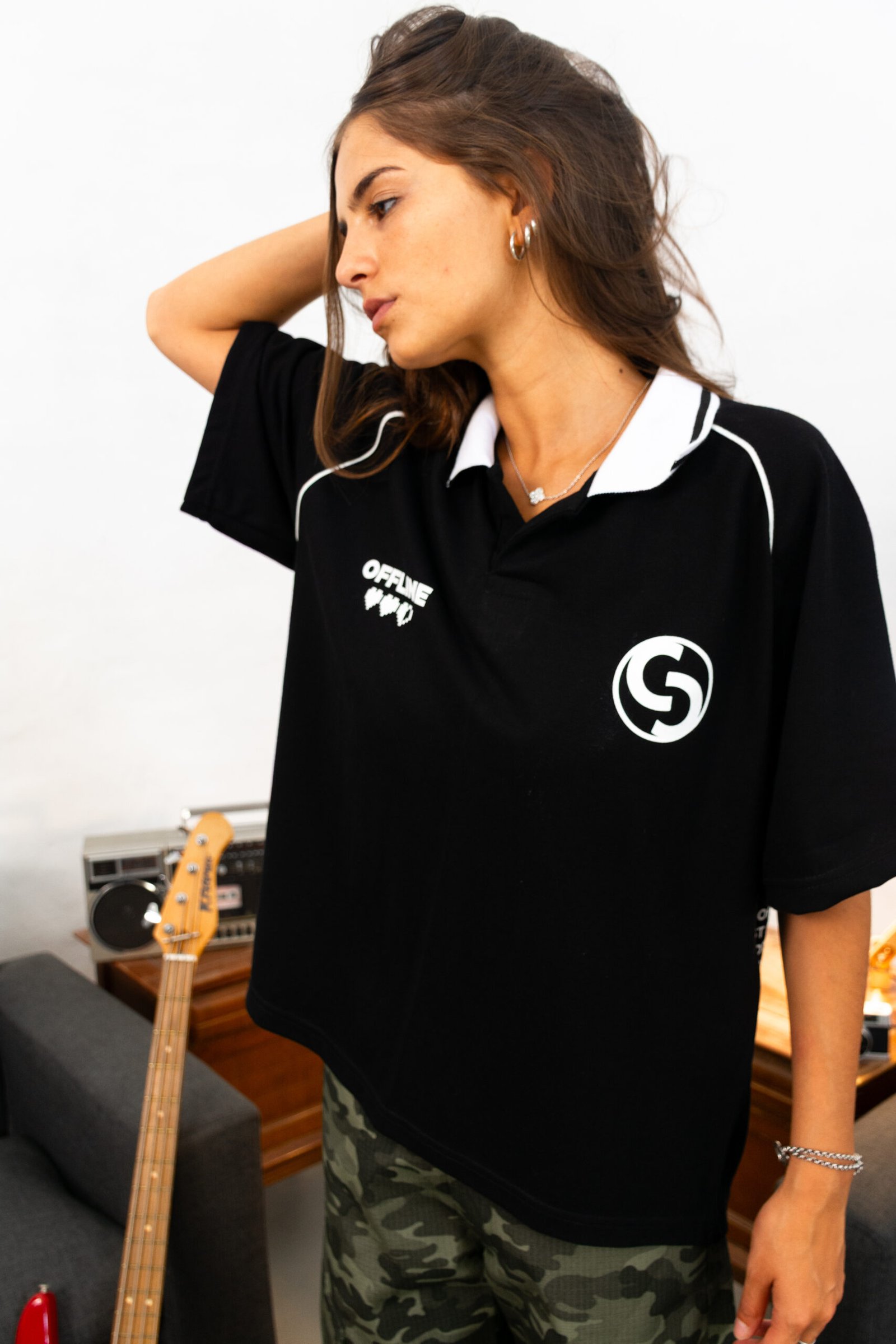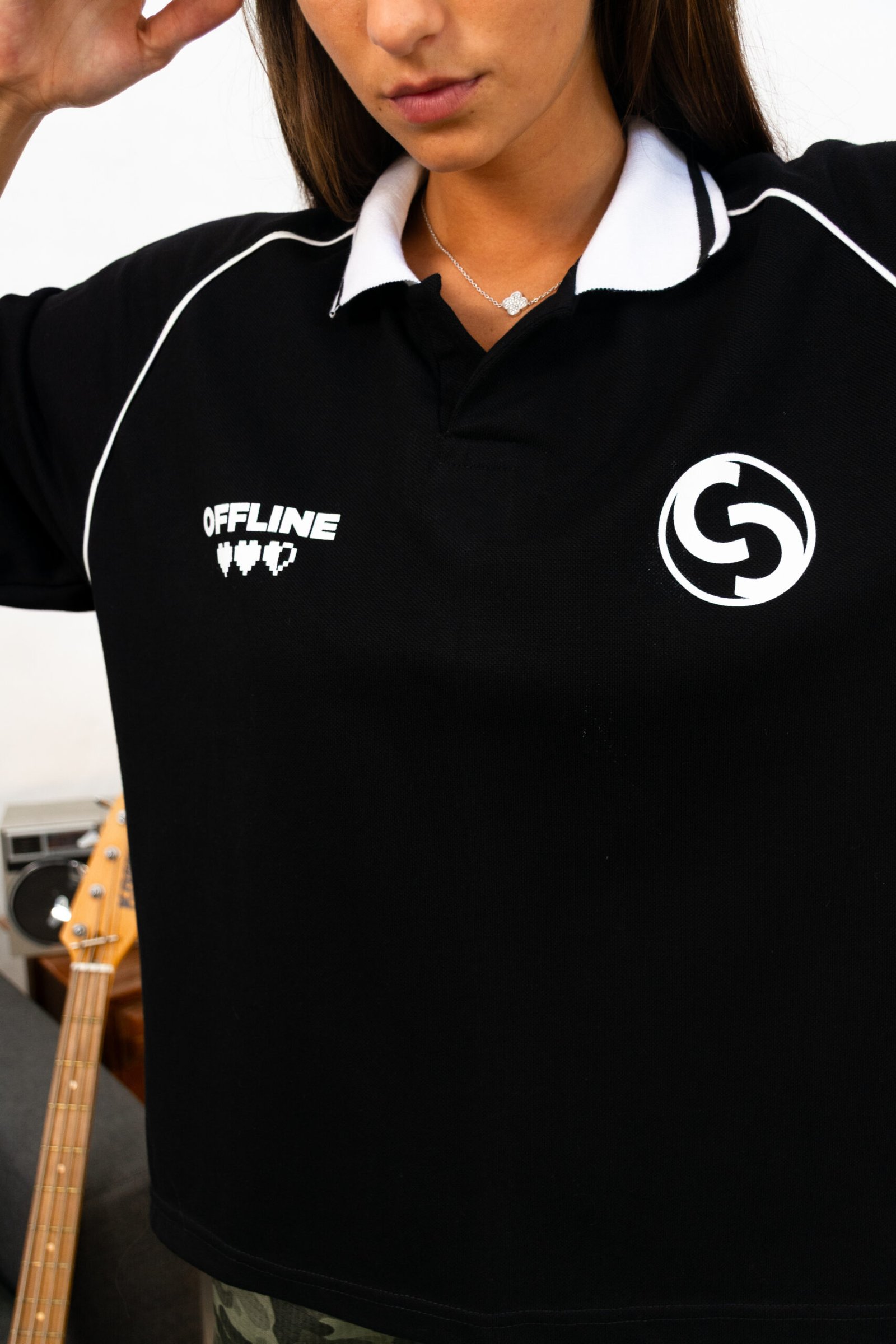 Polo negra de calce boxy con manga ranglán corta. Detalles en contraste, cuello blanco con diseño y estampas en serigrafía en frente y espalda.