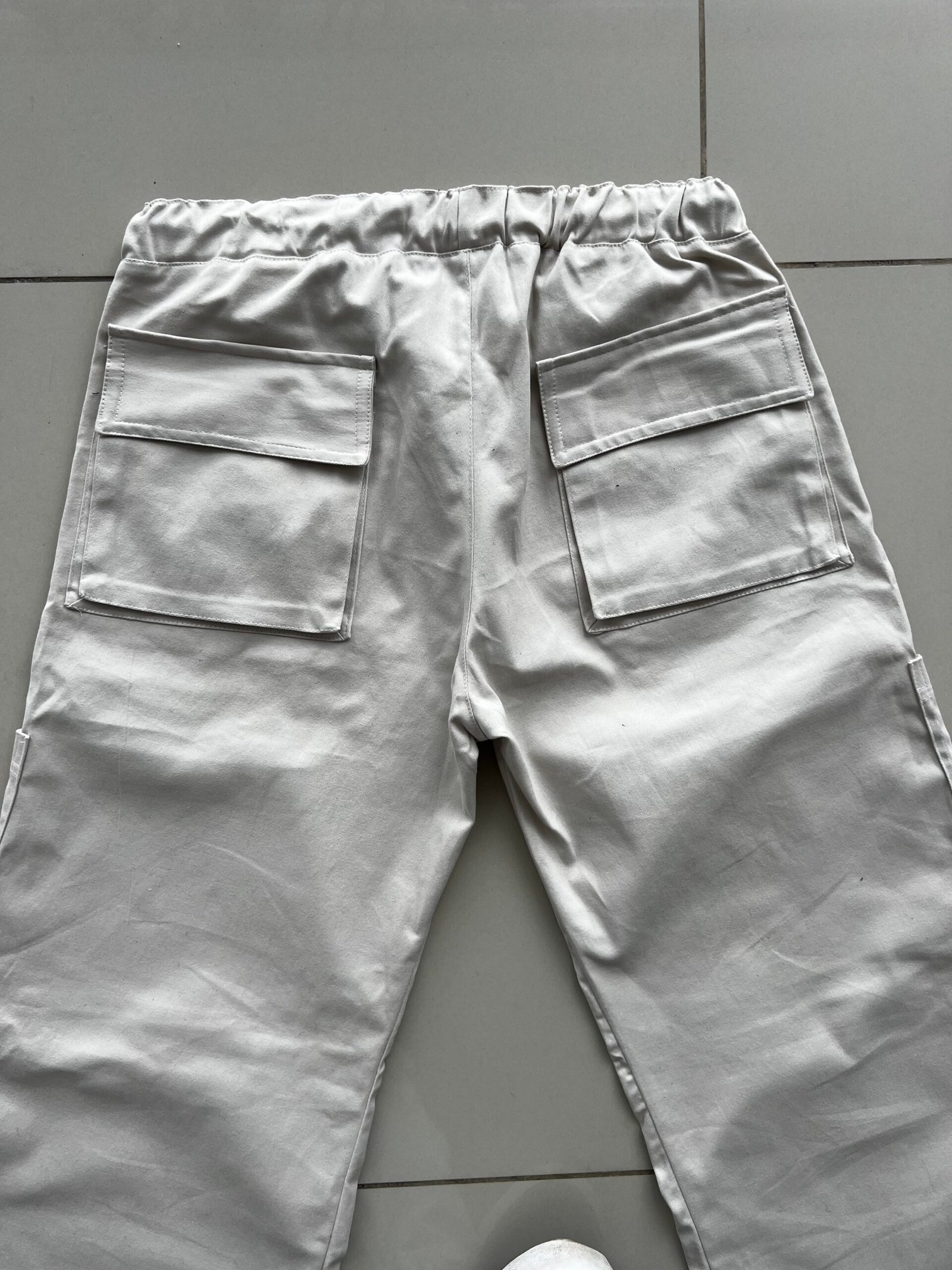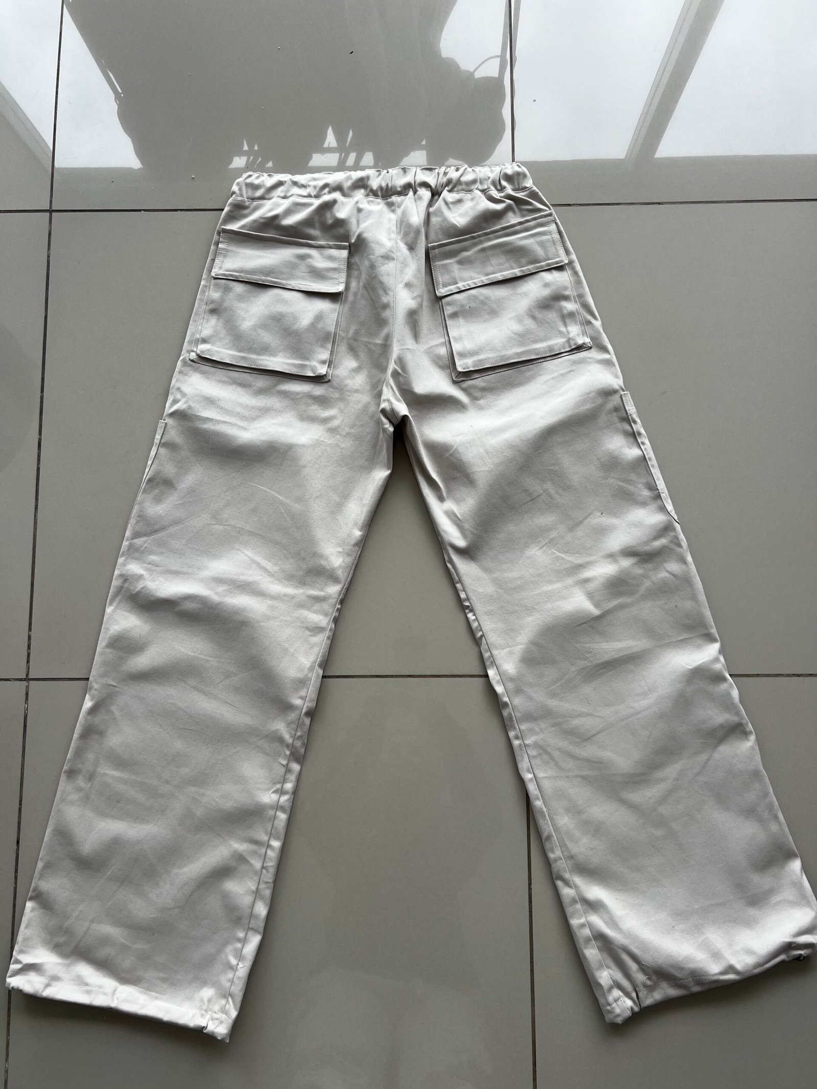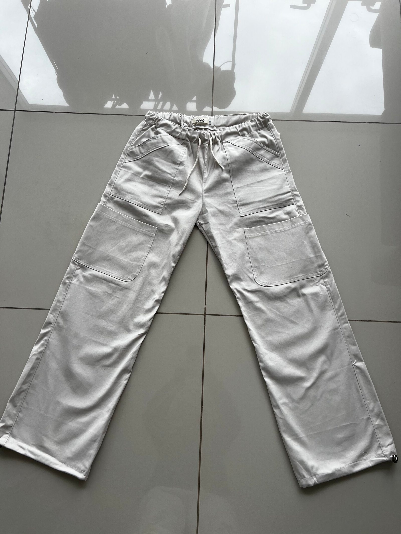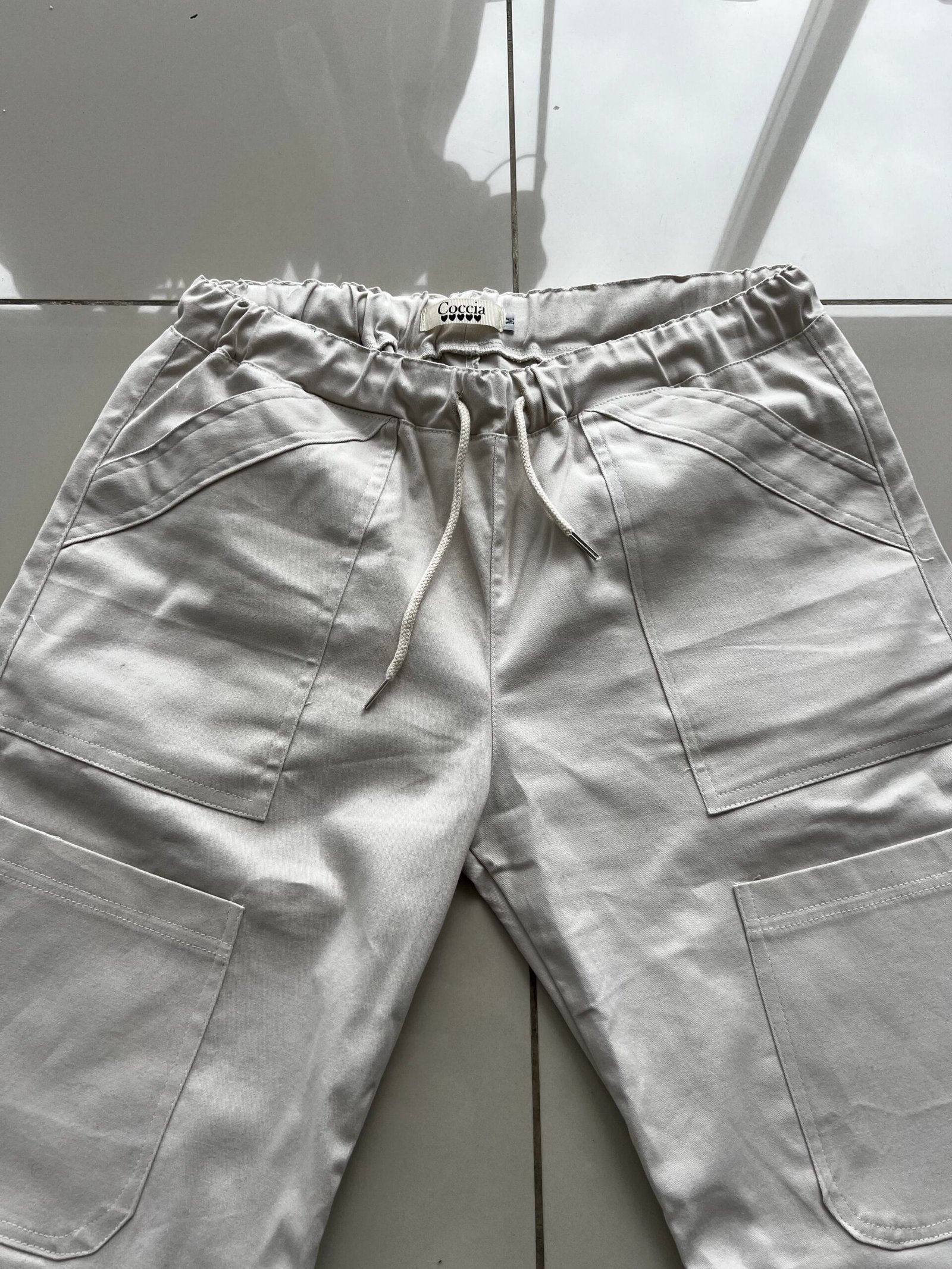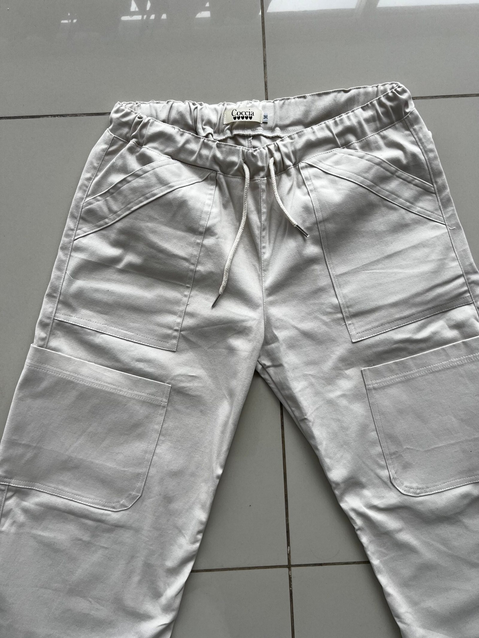 Pantalón tiro bajo, estilo cargo de gabardina peinada, con cordón en cintura y elástico regulador en tobillos.