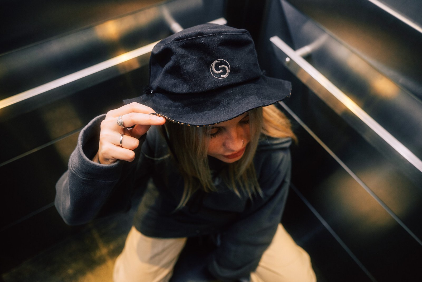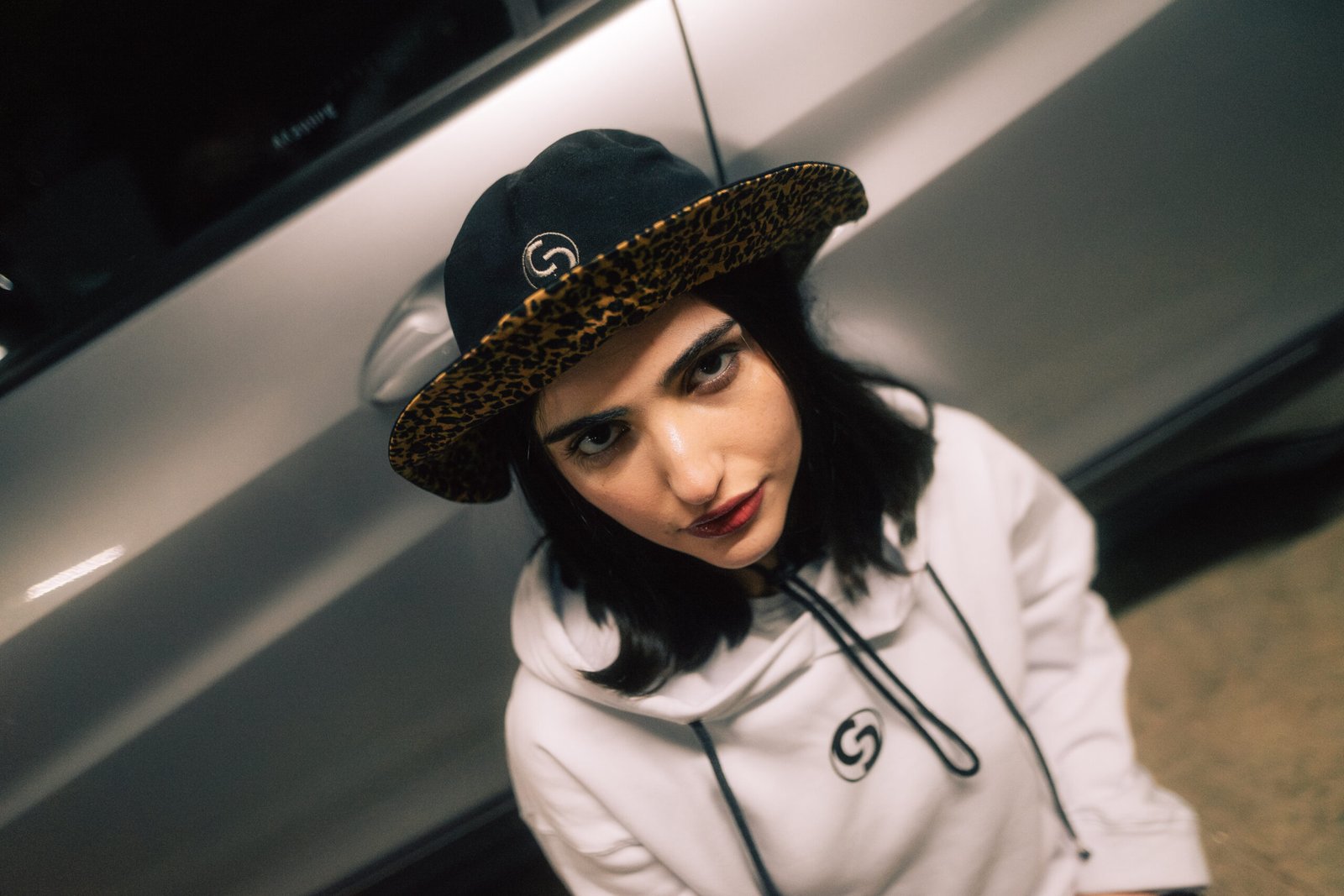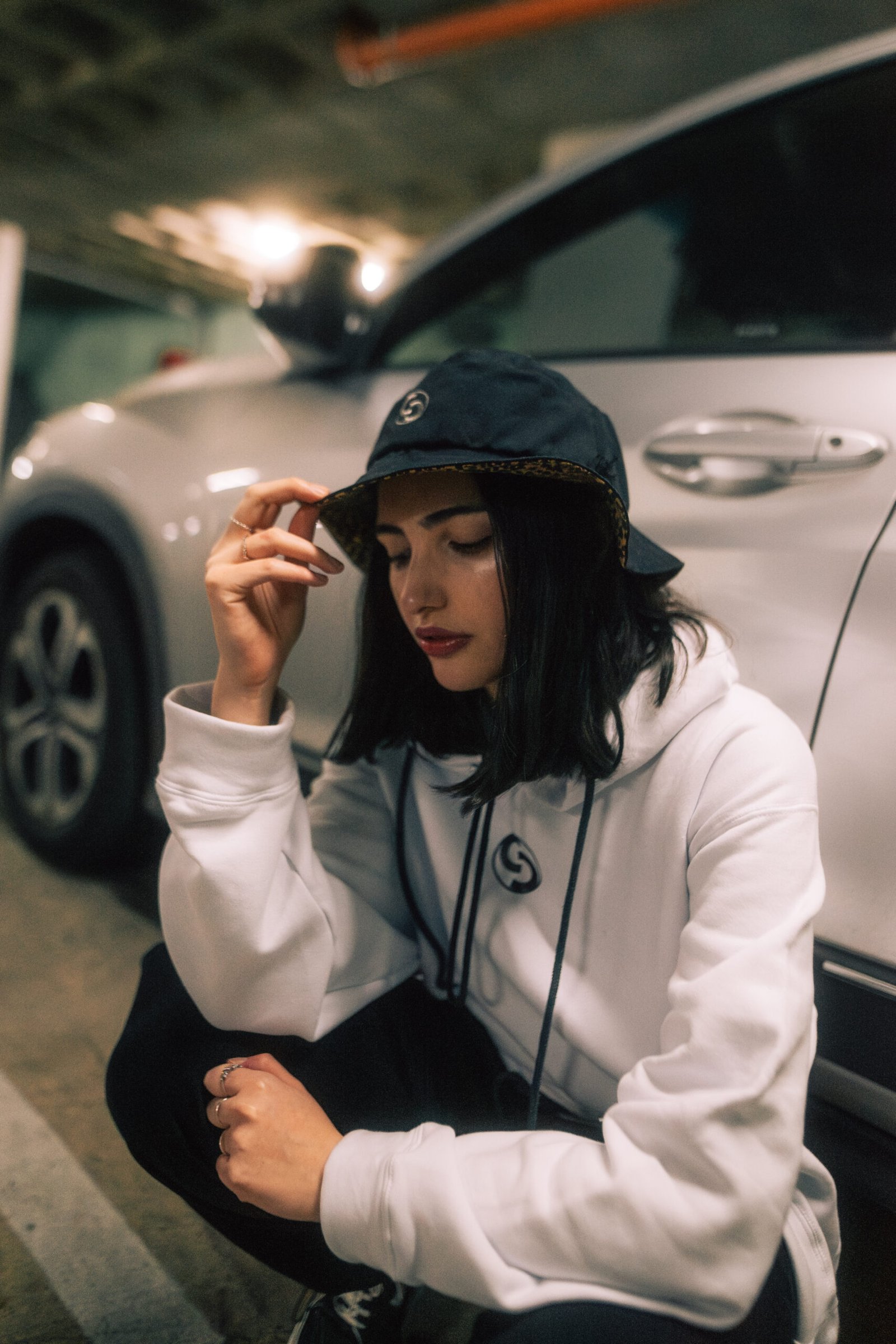 Piluso estilo pescador, de color negro con interior animal print, logo bordado y cordón regulable.