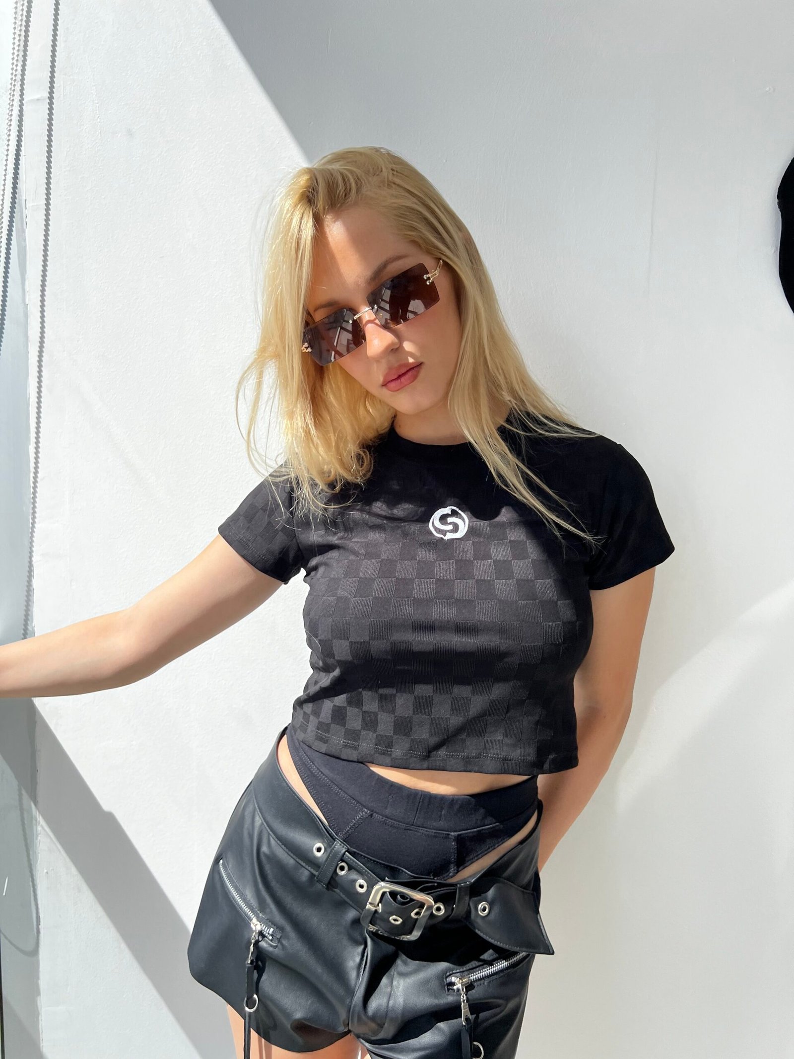 Remera baby tee de jersey a cuadros, con bordado personalizado de logo Di Coccia.