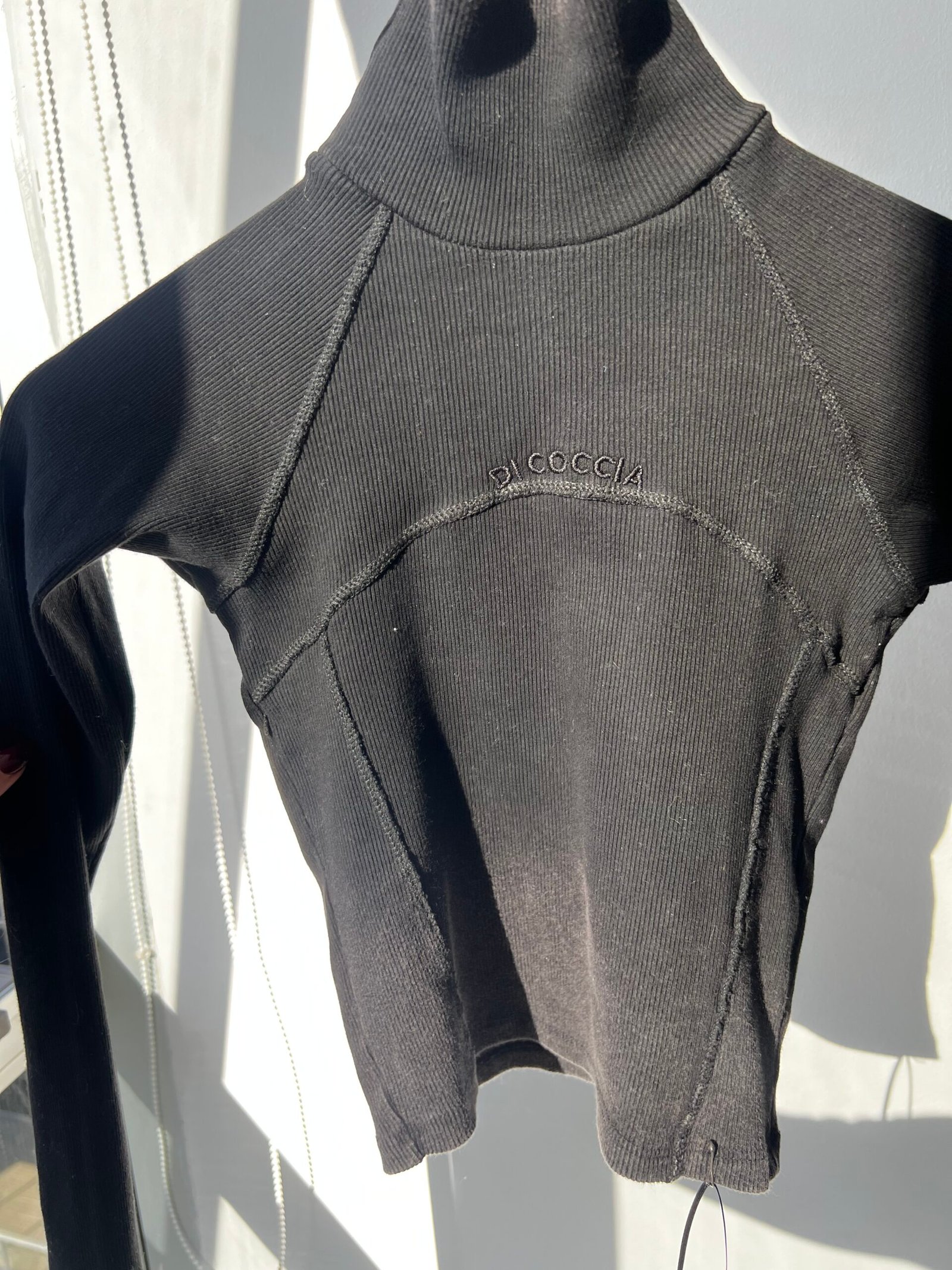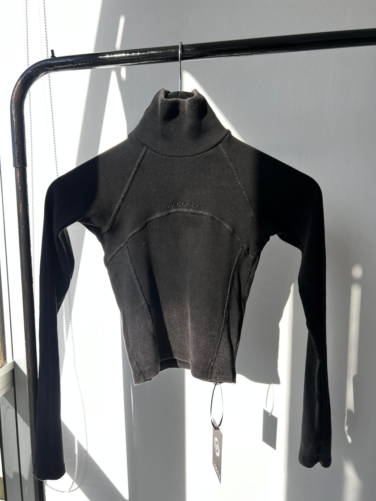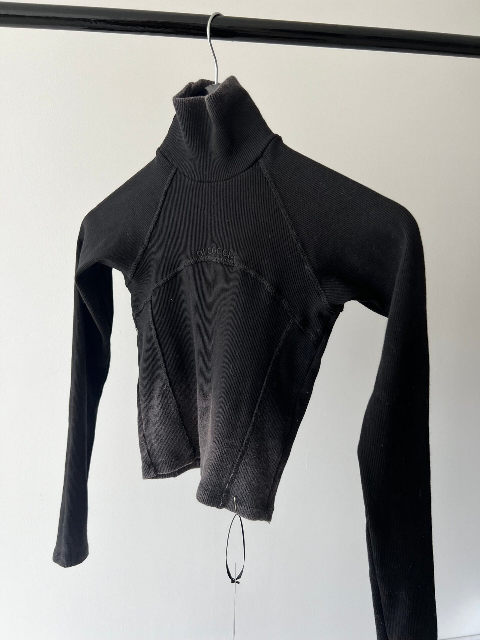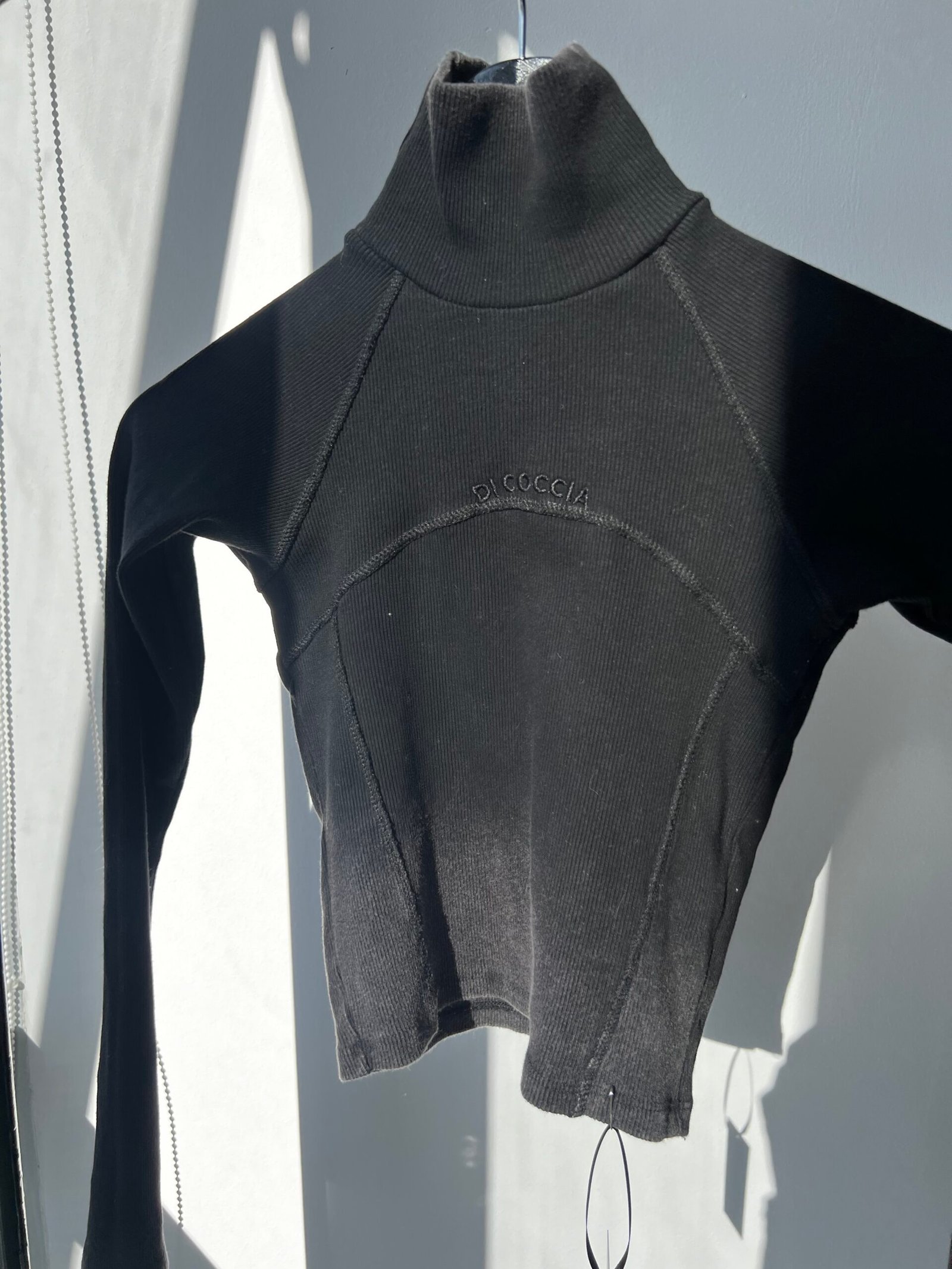 Top polera de morley negra con efecto washed, diseño con recortes, costuras grises y bordado Di Coccia.
