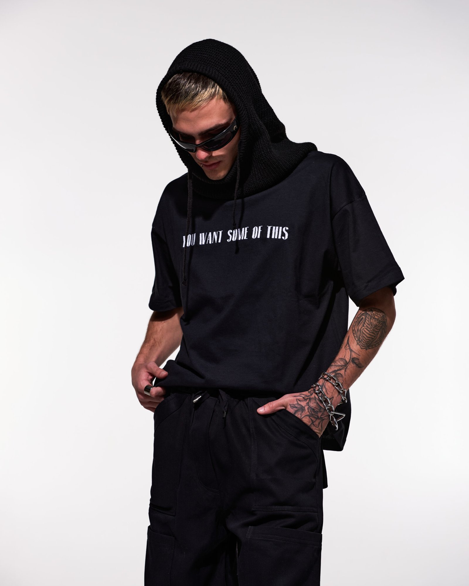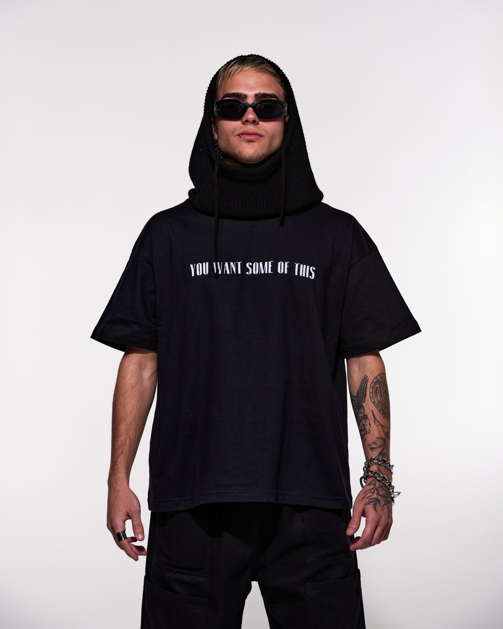 Remera negra de algodón corte boxi con bordado blanco “you want some of this”.