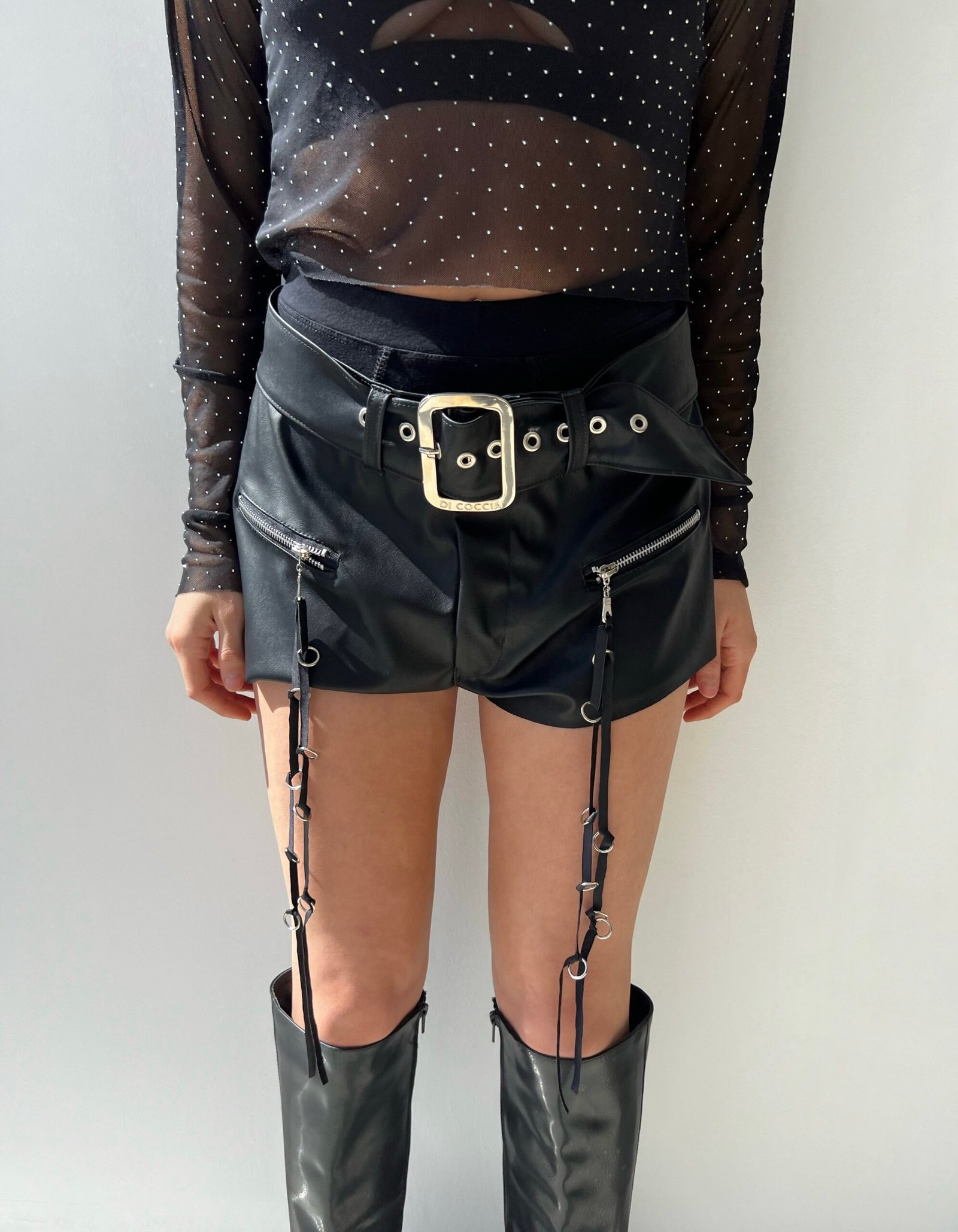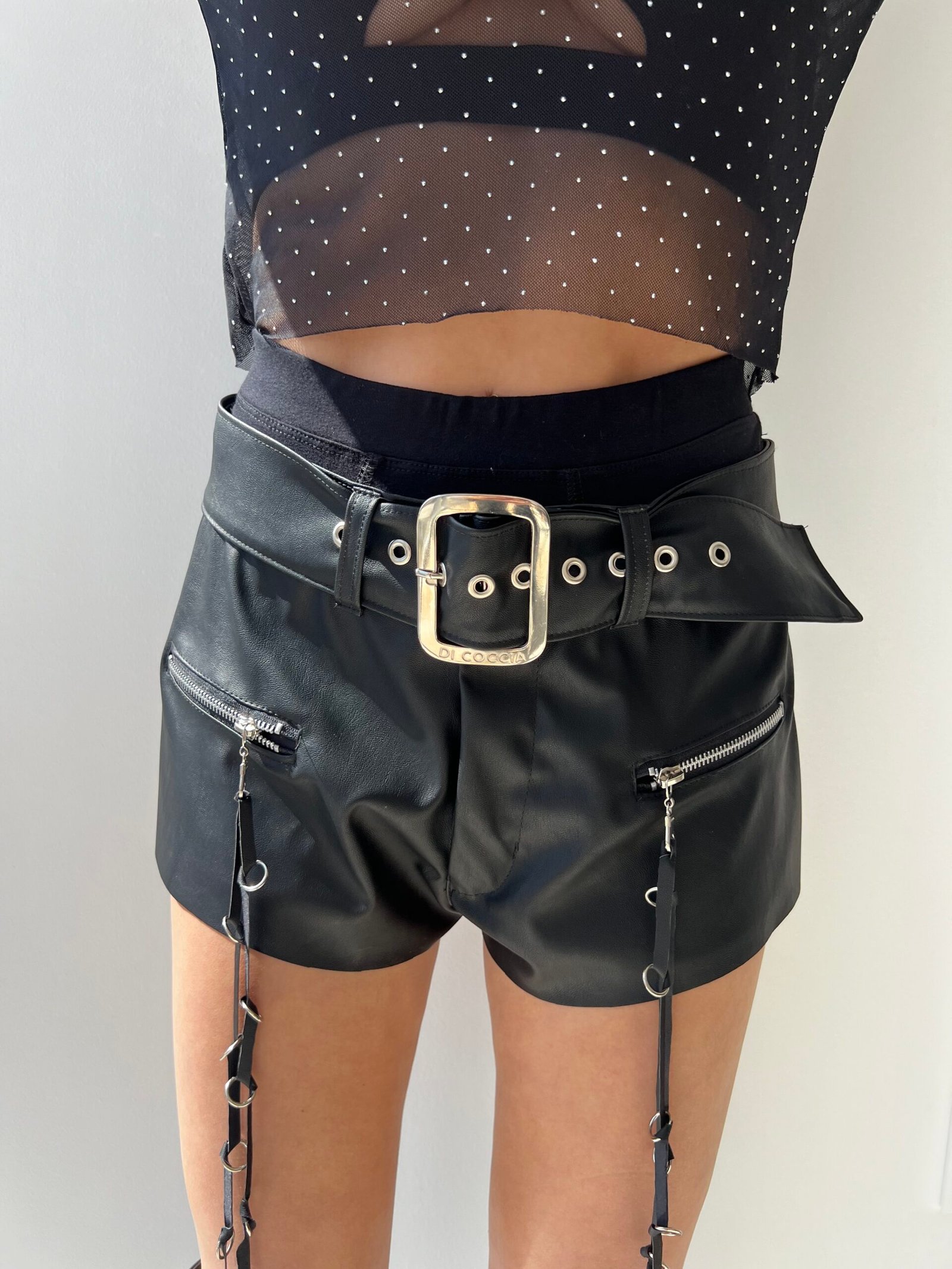 Diseño exclusivo de Di Coccia, cuenta con un cinto de hebilla personalizada, este modelo destaca por sus cierres en el frente y sus tiras con argollas de metal, realizadas artesanalmente. El corte fue diseñado para usar el short tiro bajo, con un estilo oversize pero el cinto permite la versatilidad para regularlo como tiro medio/alto.