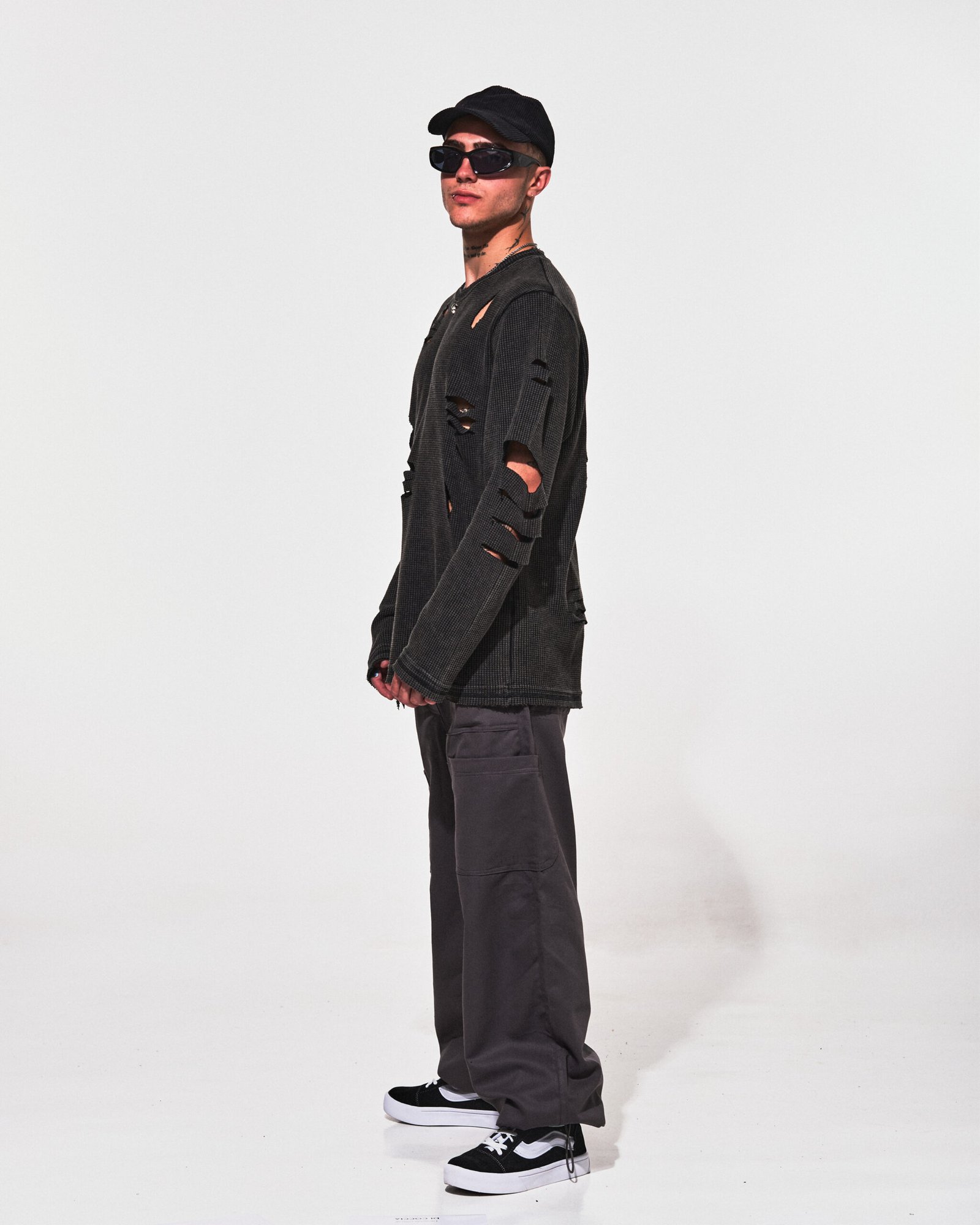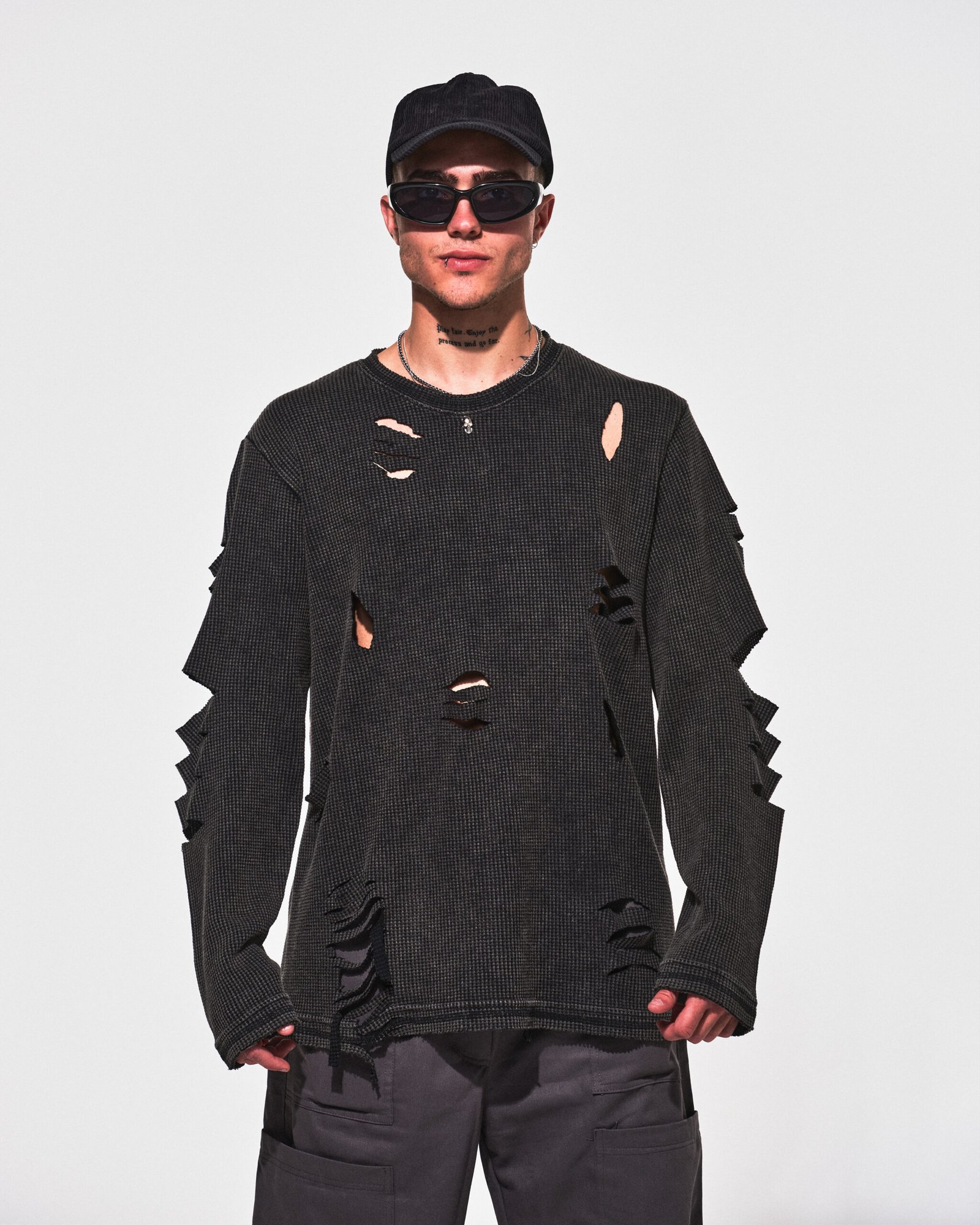Sweater de algodón “wafle” color negro con efecto washed, customizado con recortes y falso dije de calavera.