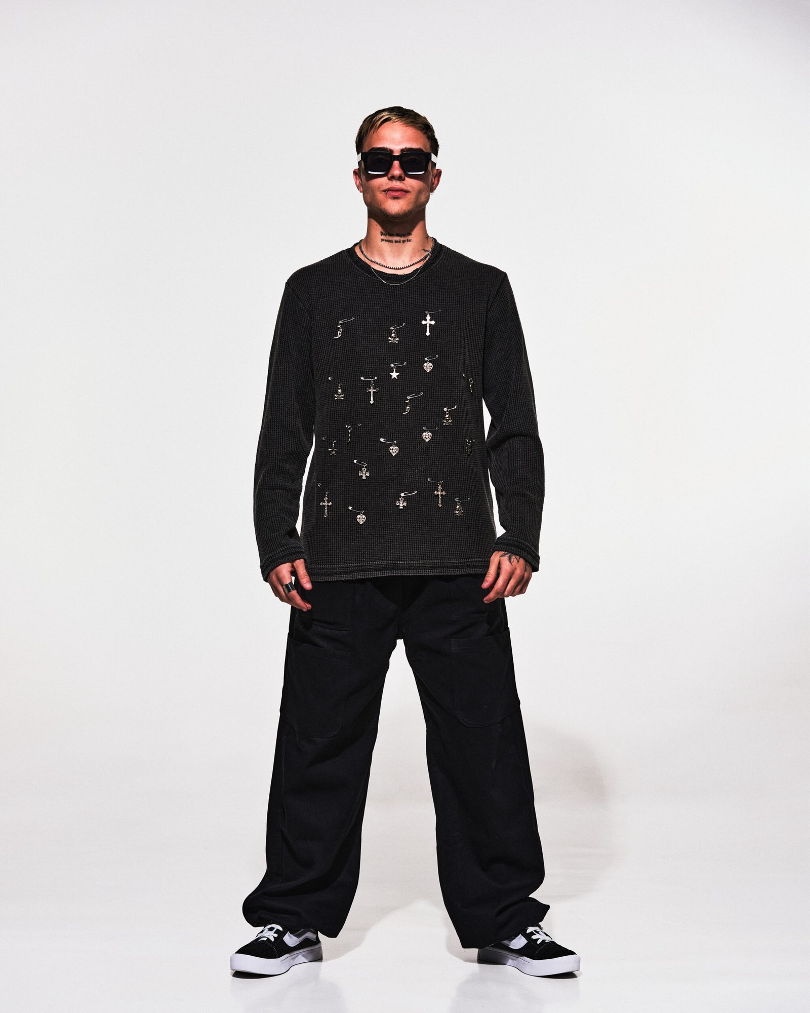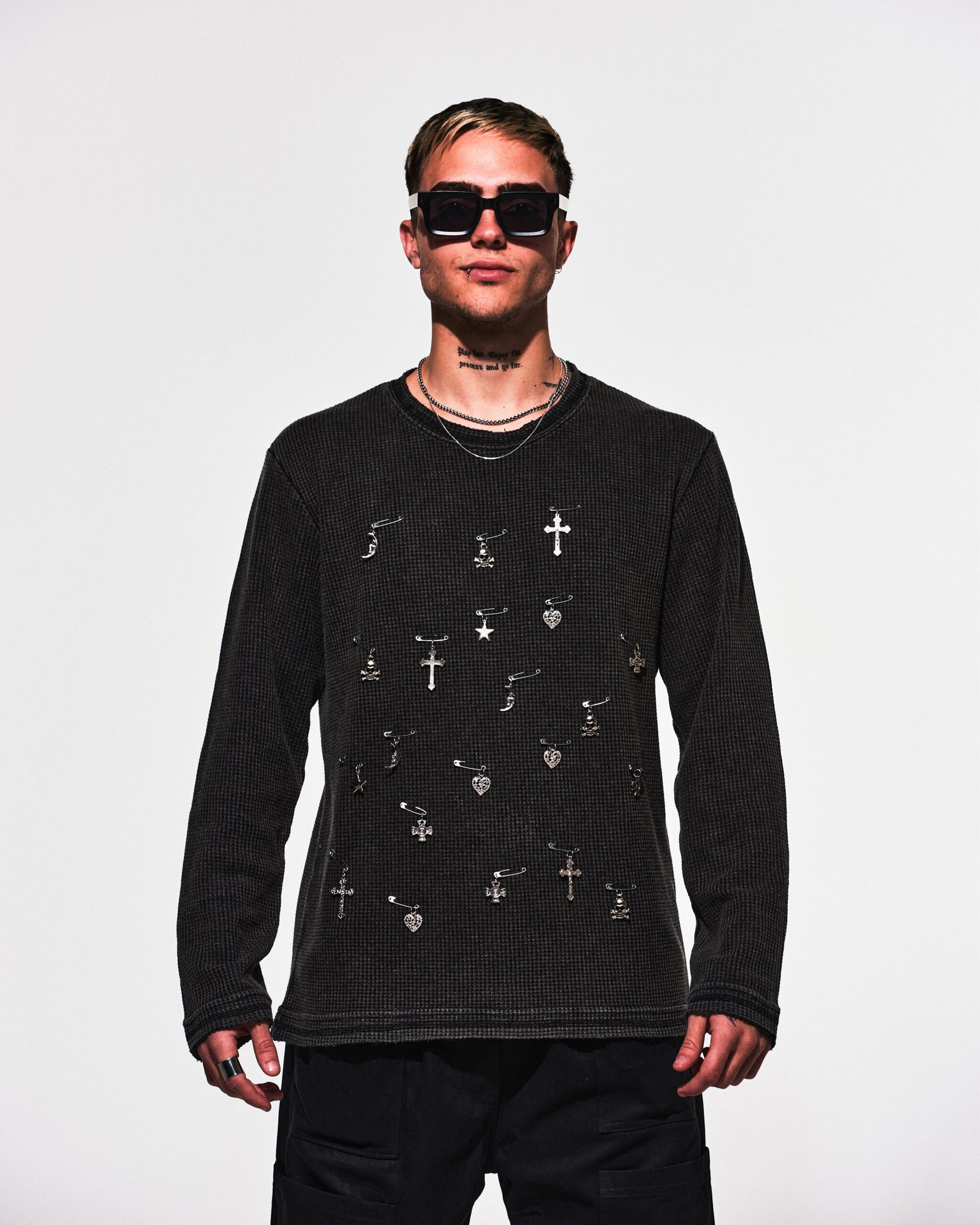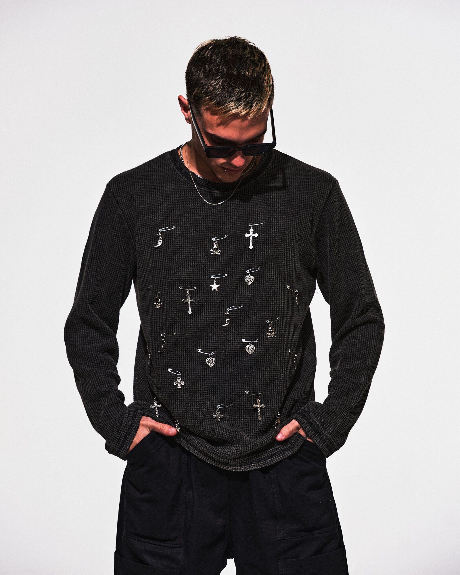 Sweater de algodón “wafle” color negro con efecto washed, customizado con ganchos de alfiler y dijes.
