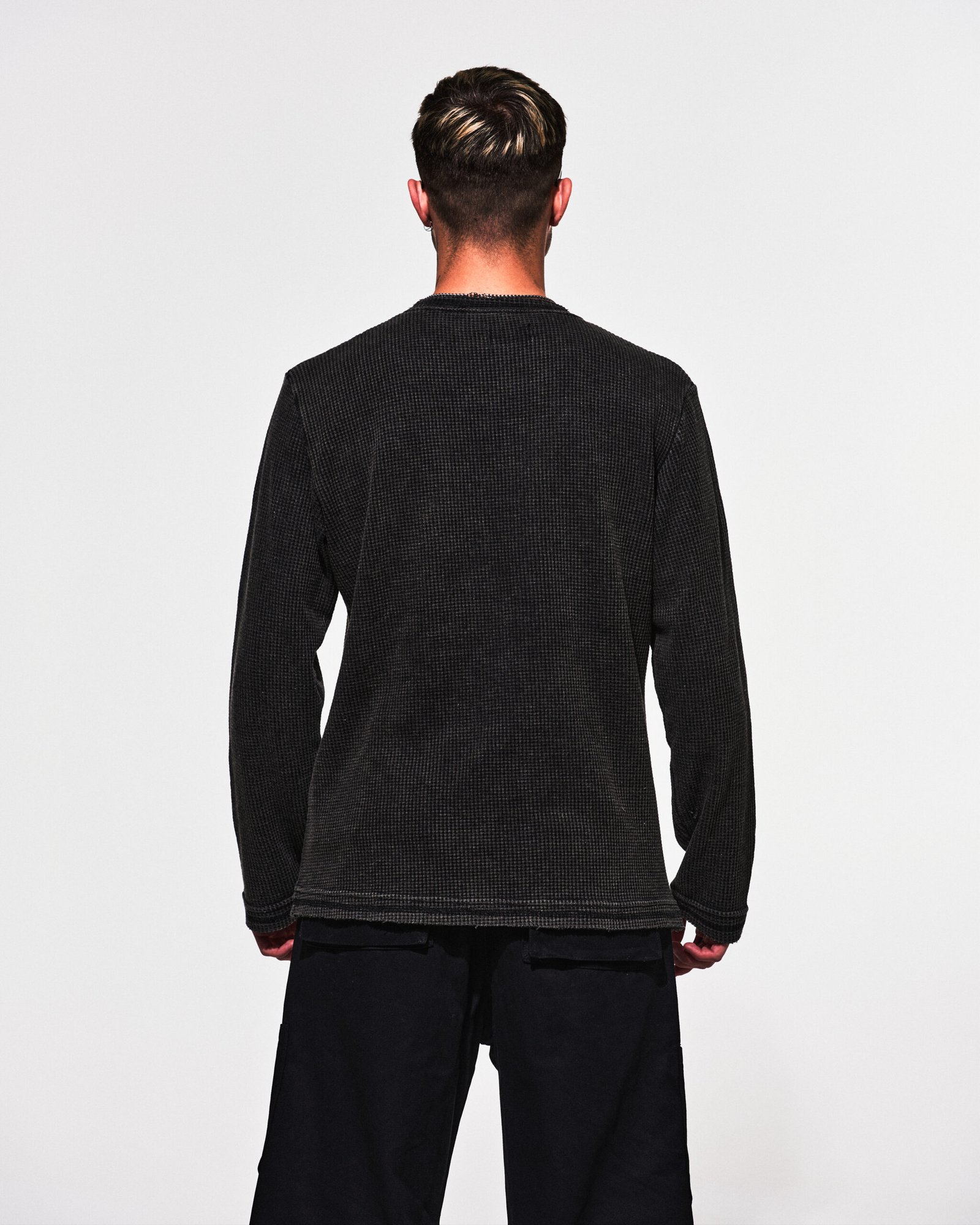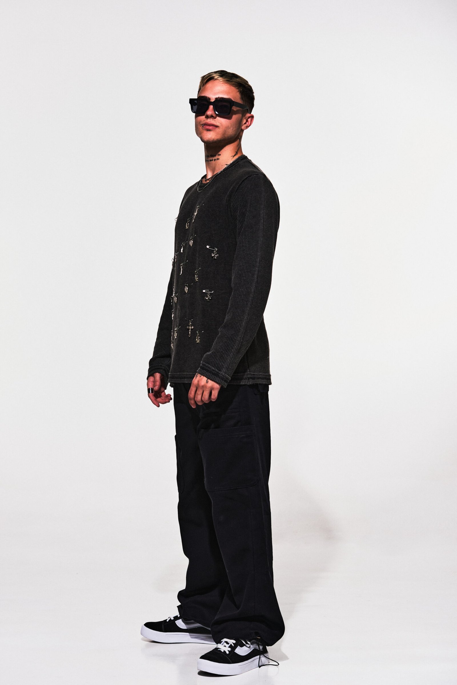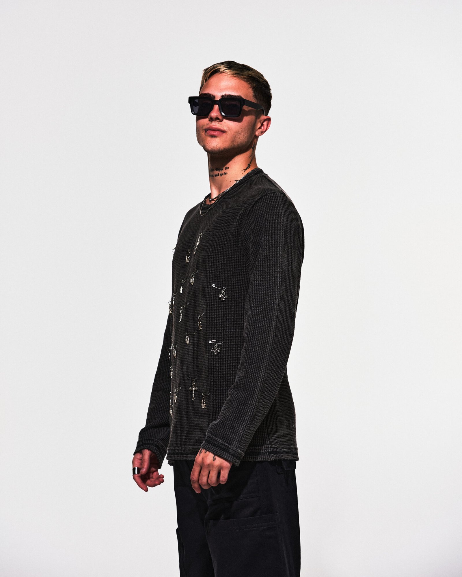 Sweater de algodón “wafle” color negro con efecto washed, customizado con ganchos de alfiler y dijes.