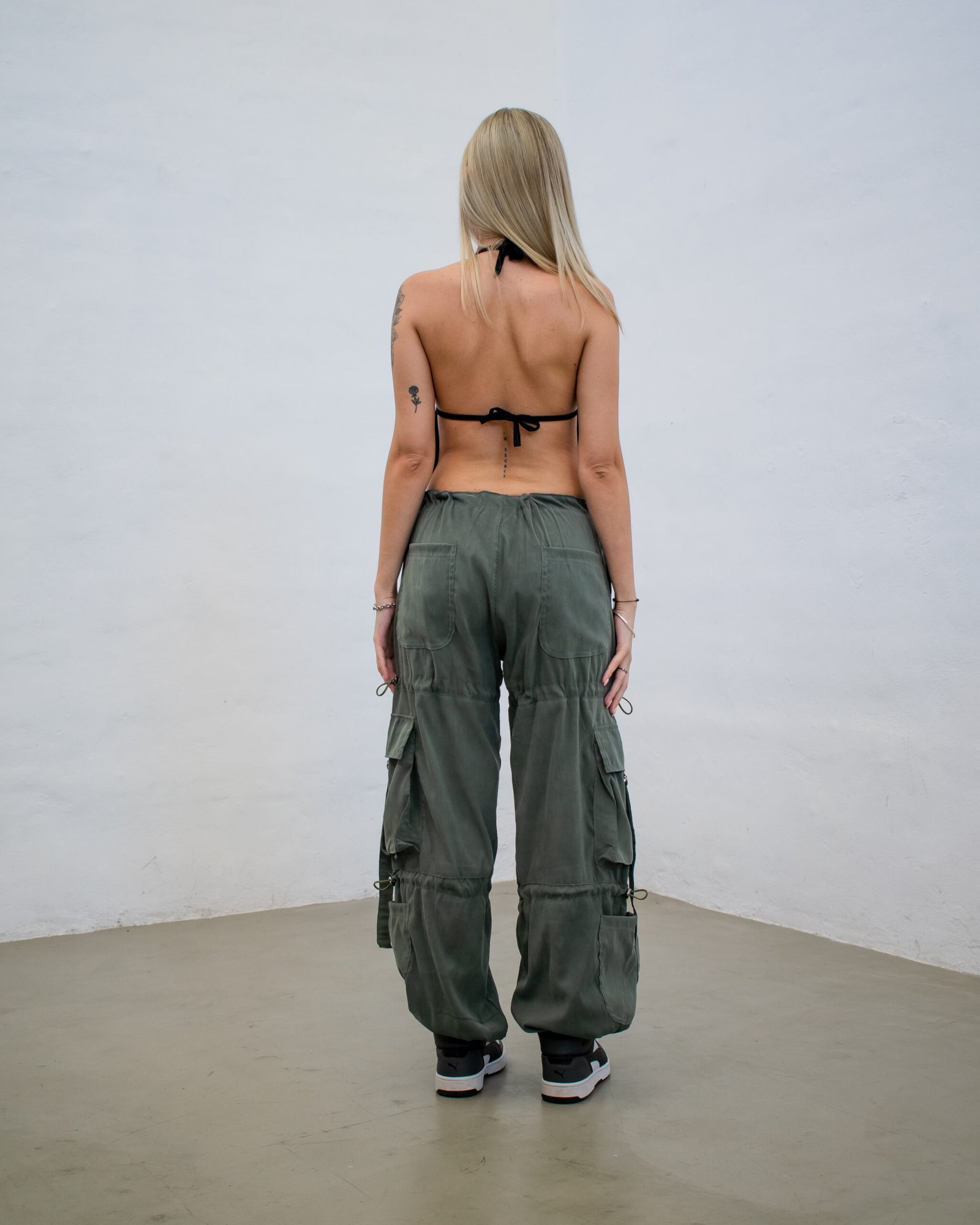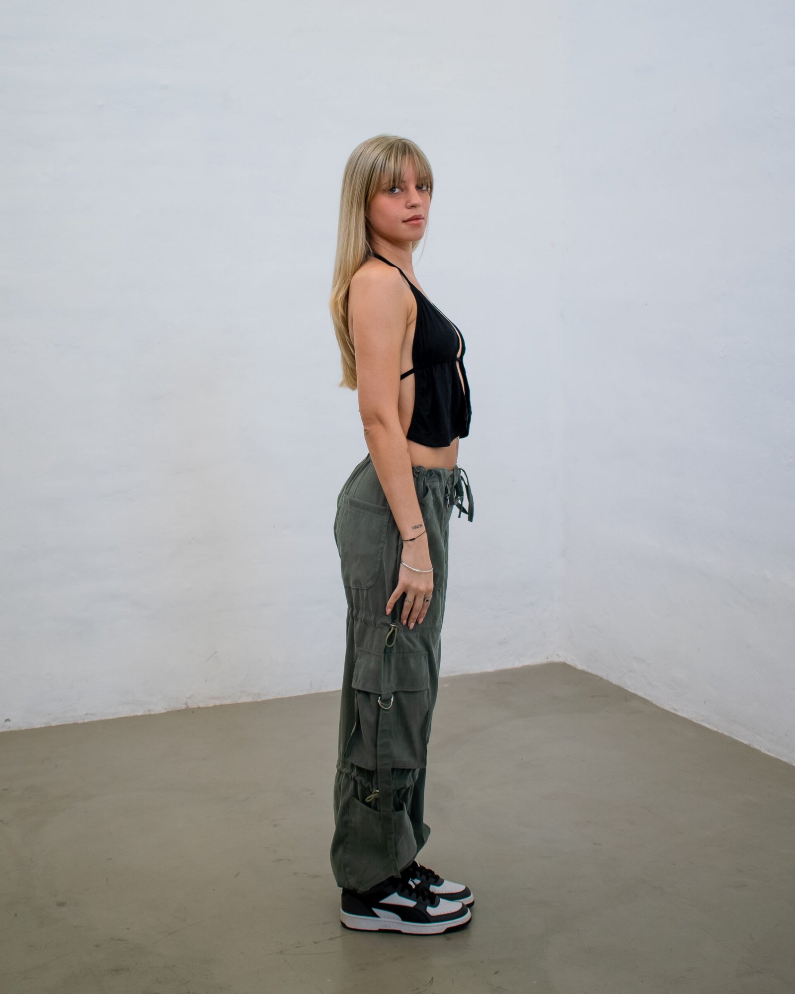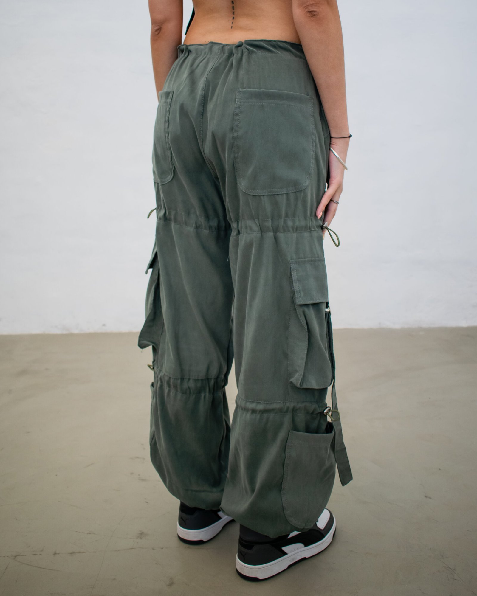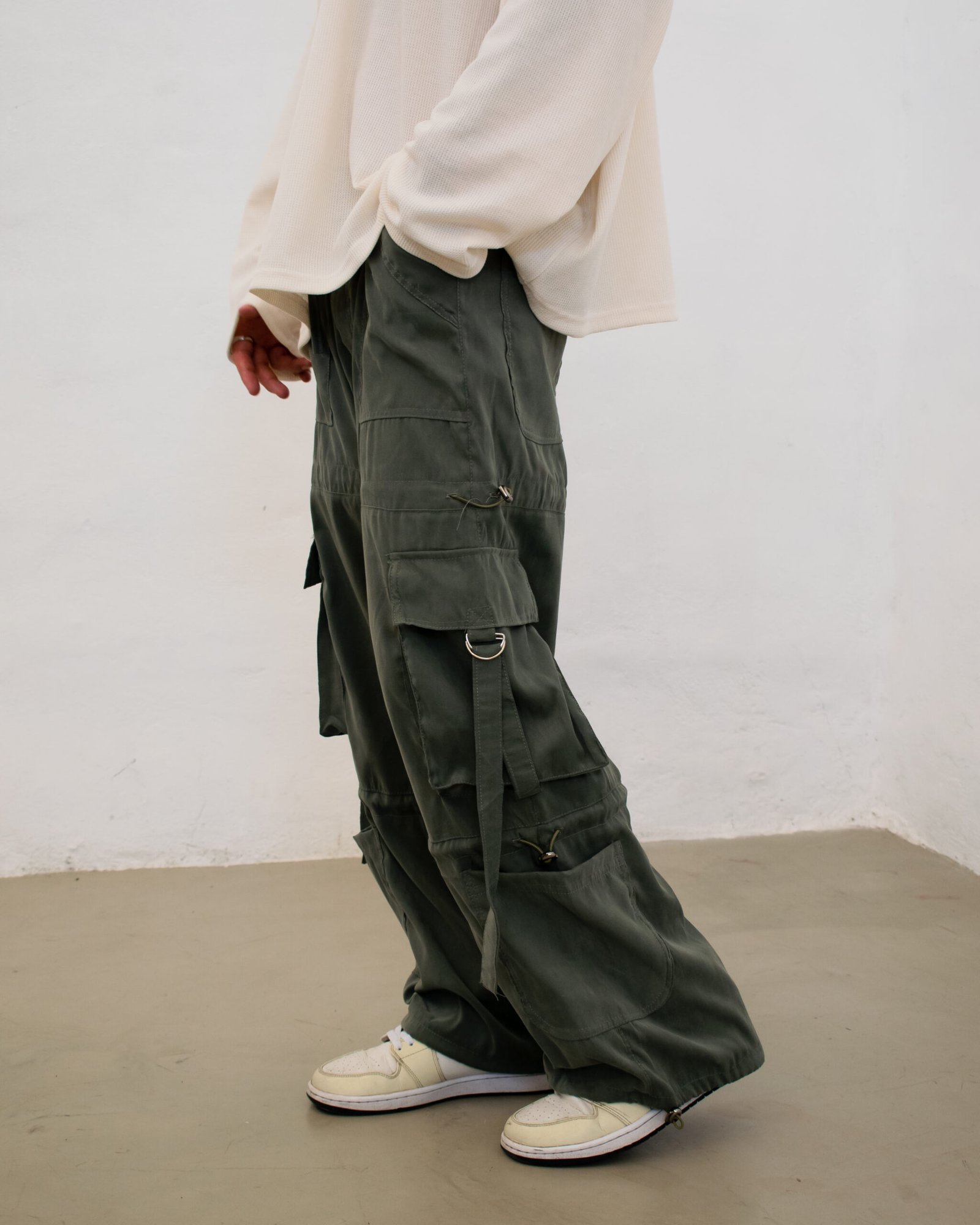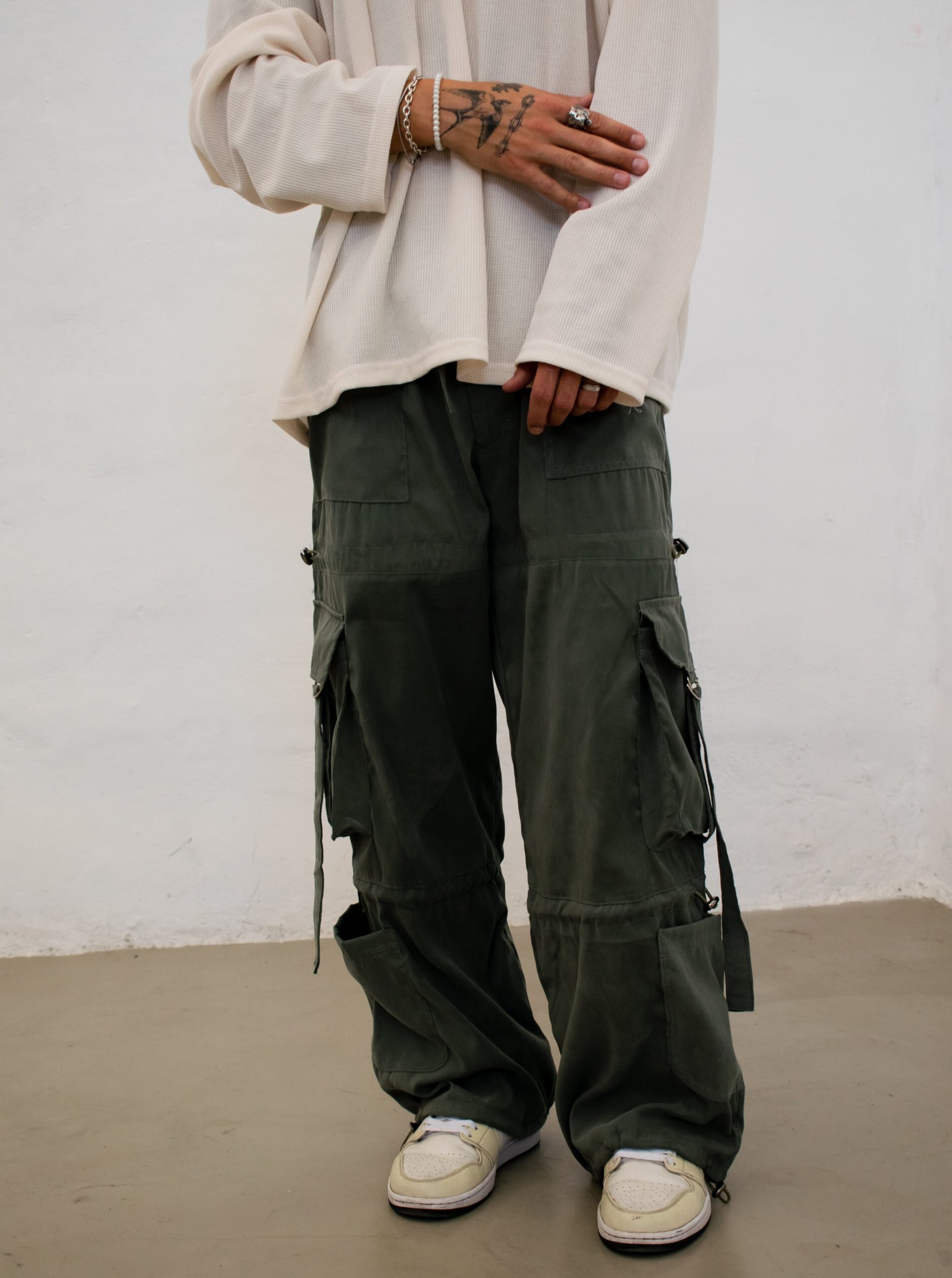 Pantalon oversize de sastrero suede con cordón regulador y cierre. Regulador metalizado con elástico en el ruedo, bolsillos cargo con detalle de tiras, detalle de gancho en la cintura y recortes con elástico y reguladores . El elástico en el ruedo permite usar el pantalón suelto o a modo de babucha. El cordón en la cintura permite una versatilidad en los talles.