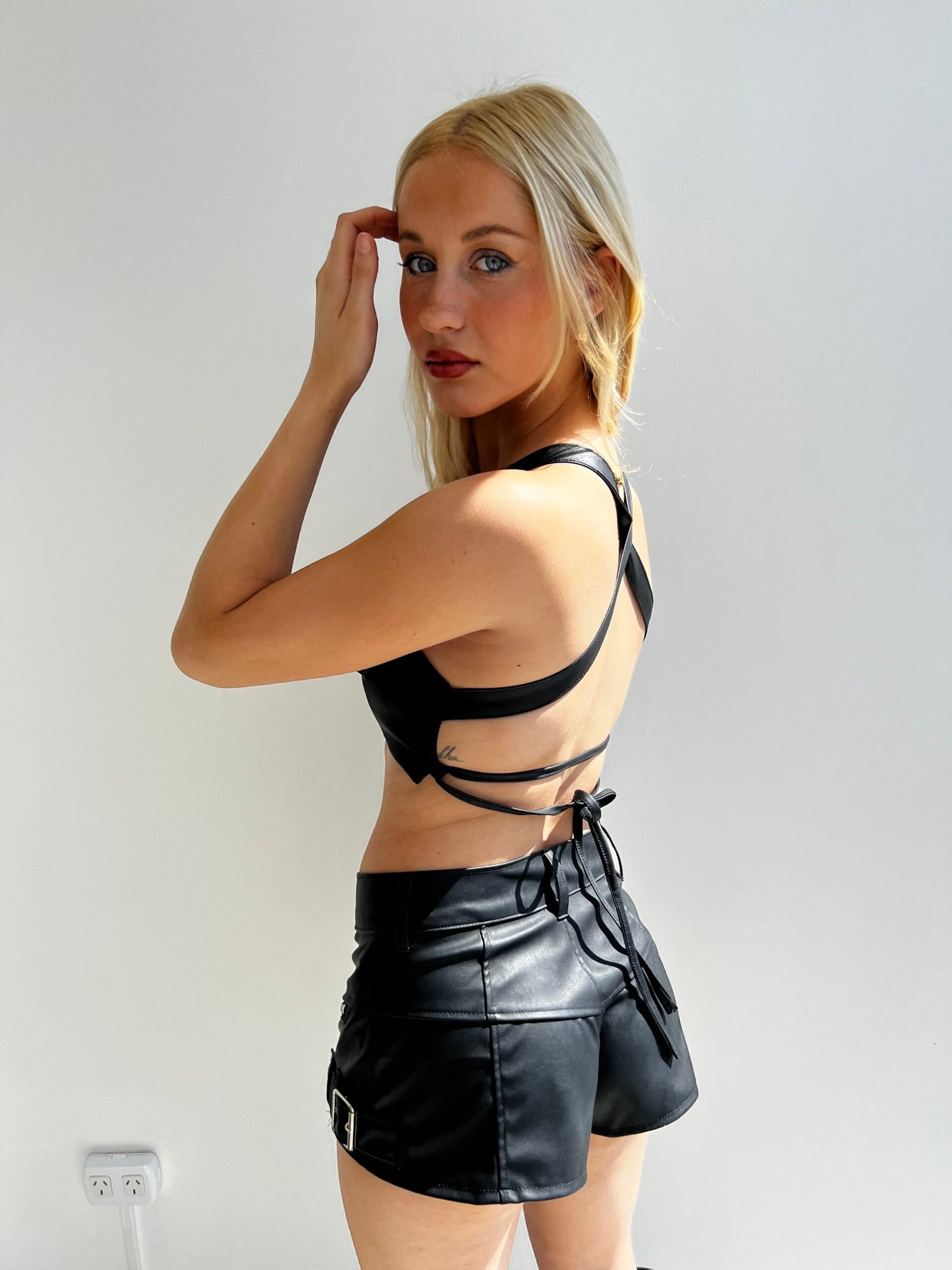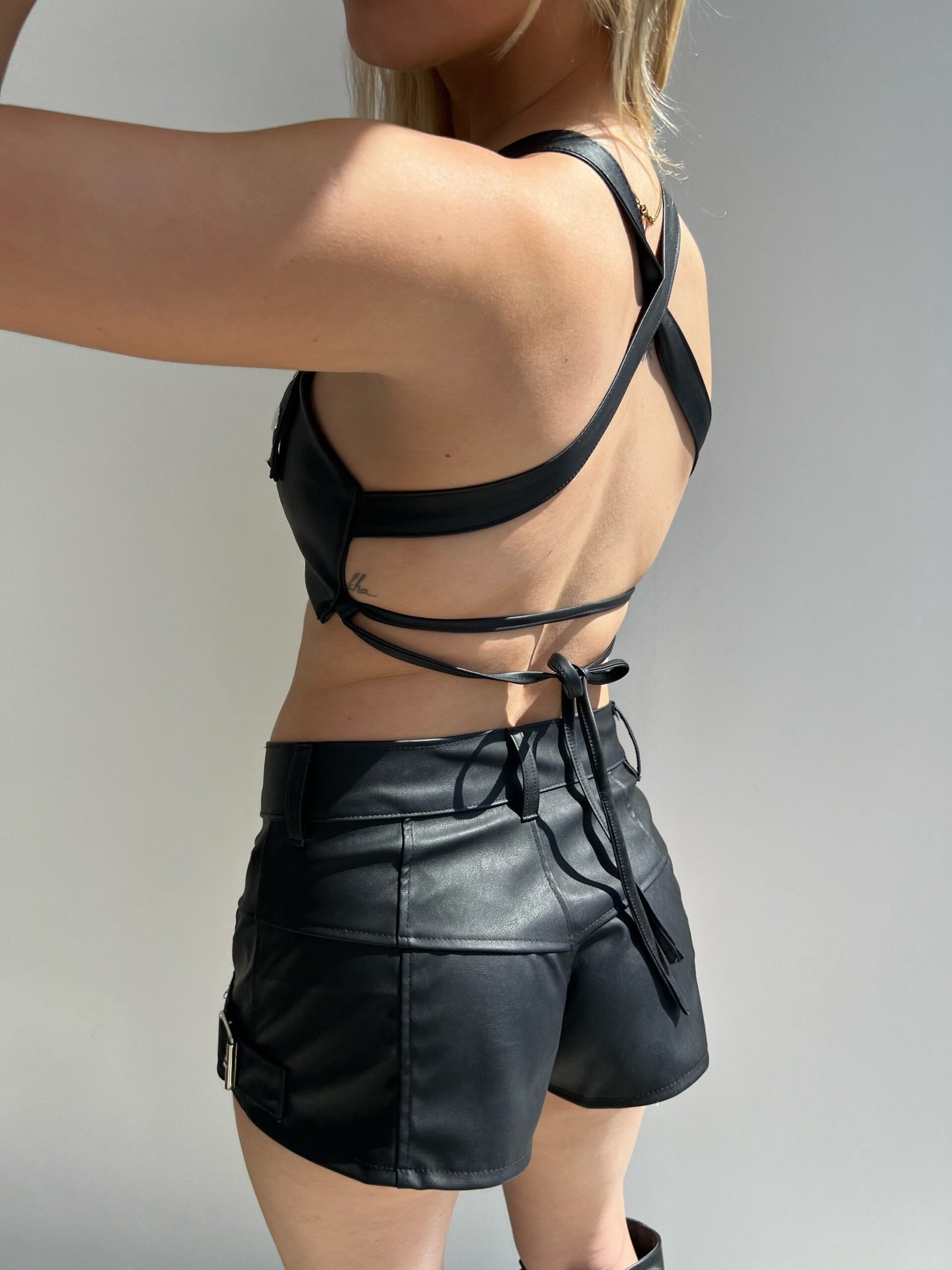Micro top de eco cuero con tiras regulables y botones prendedores.